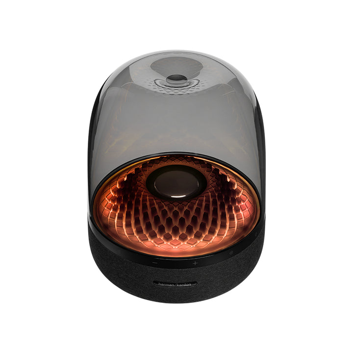 Aura Studio 4's signature transparent dome amplifies and radiates elegant ambient illumination in all directions. Inspired by the beauty of the natural world, the shifting patterns and colors of the diamond-effect lighting bring that same sense of wonder to any space. Choose between 5 distinct animated themes to match the mood of your music and delight senses.