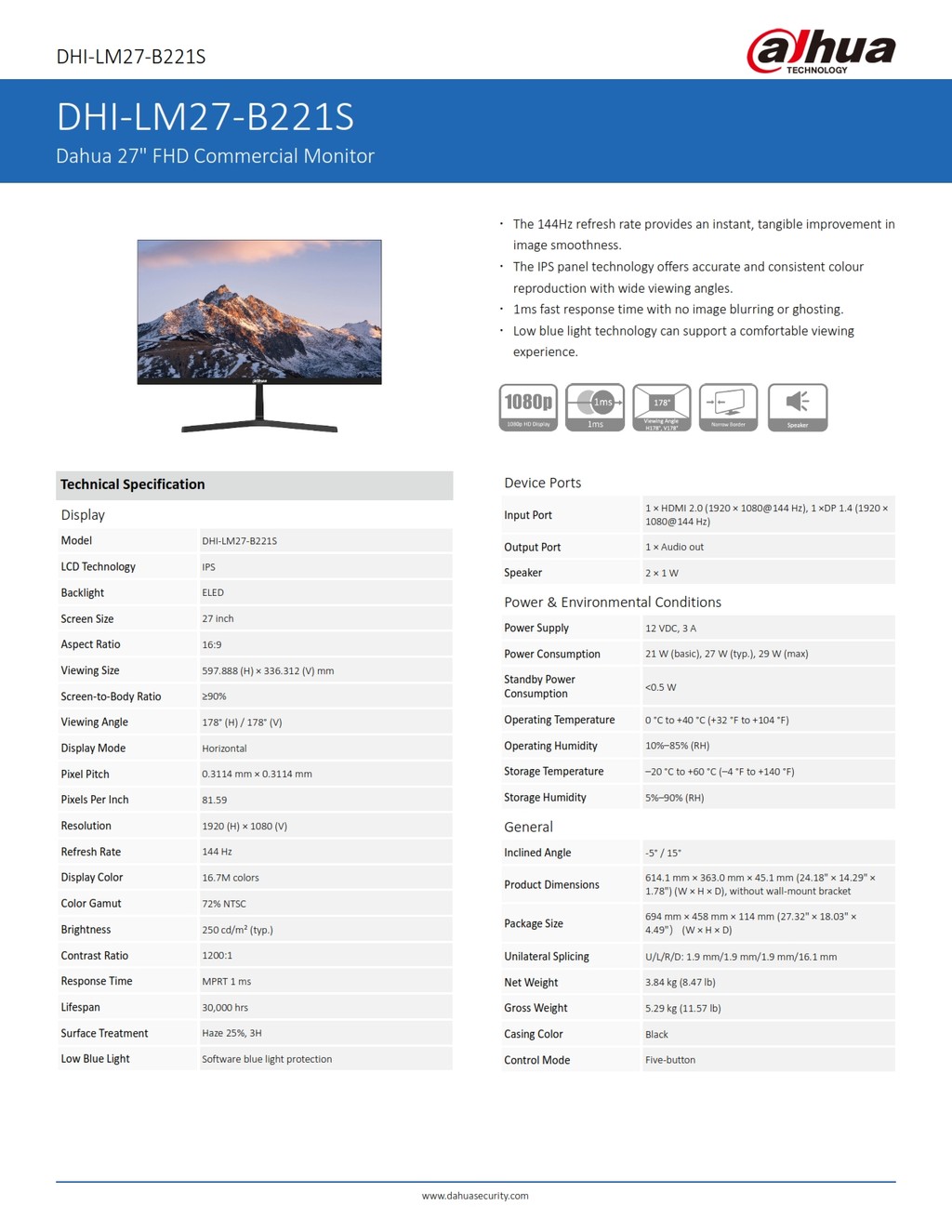 Input Port: 1 × DP 1.4 (1920 × 1080@144 Hz), 1 × HDMI 2.0 (1920 × 1080@144 Hz)
