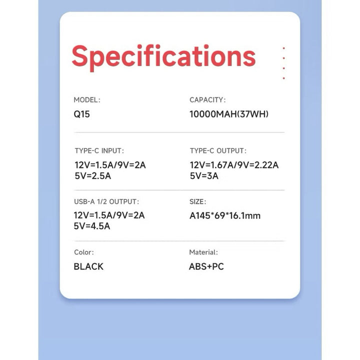 Type-C Output: 12V=1.67A/9V=2.22A/5V=3A
