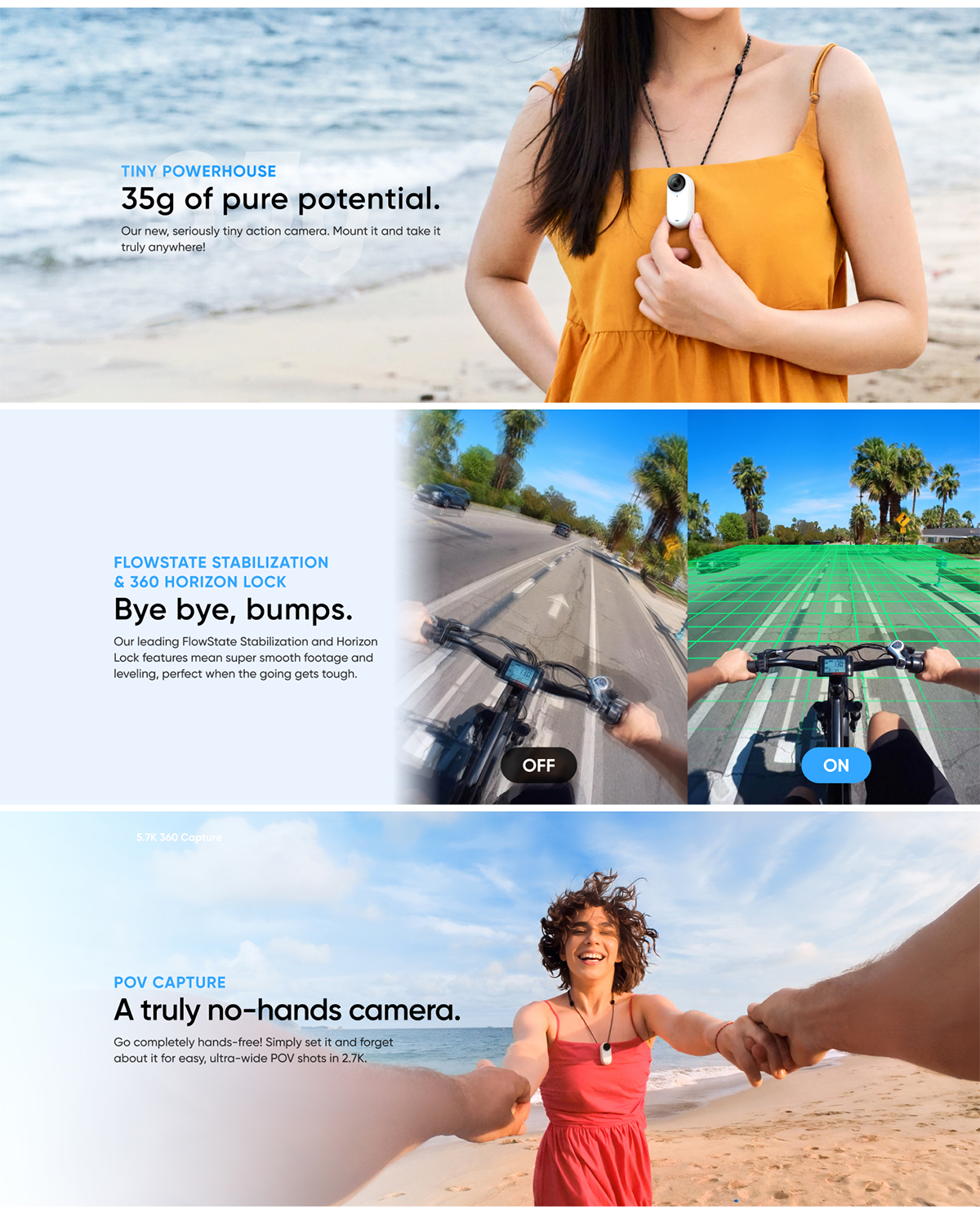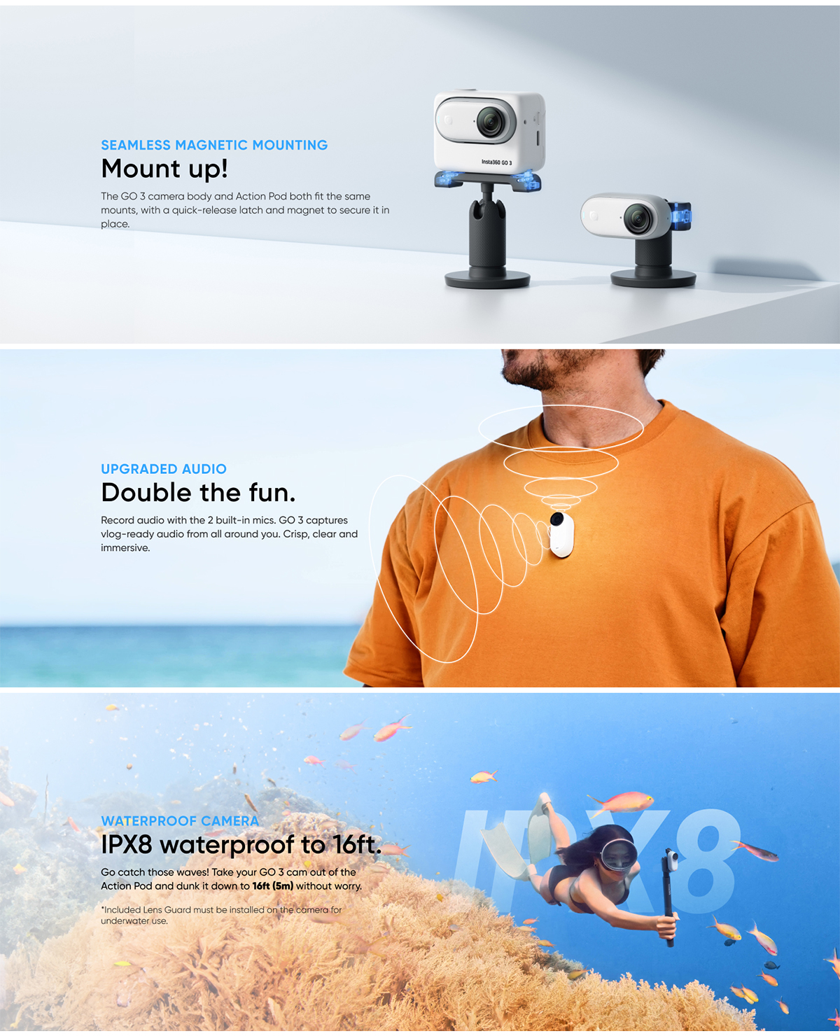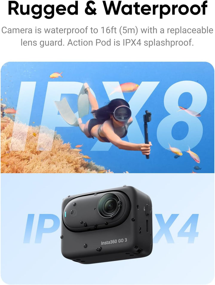 Insta360 GO 3 packs powerful performance into a tiny, rugged, magnetic body. Wear it to shoot first-person POV videos handsfree, or mount it anywhere with the in-the-box accessories. GO 3 eliminates the hassle of bulkier cameras and offers unique creative possibilities while packing powerful built-in stabilization and horizon leveling. The new multifunctional