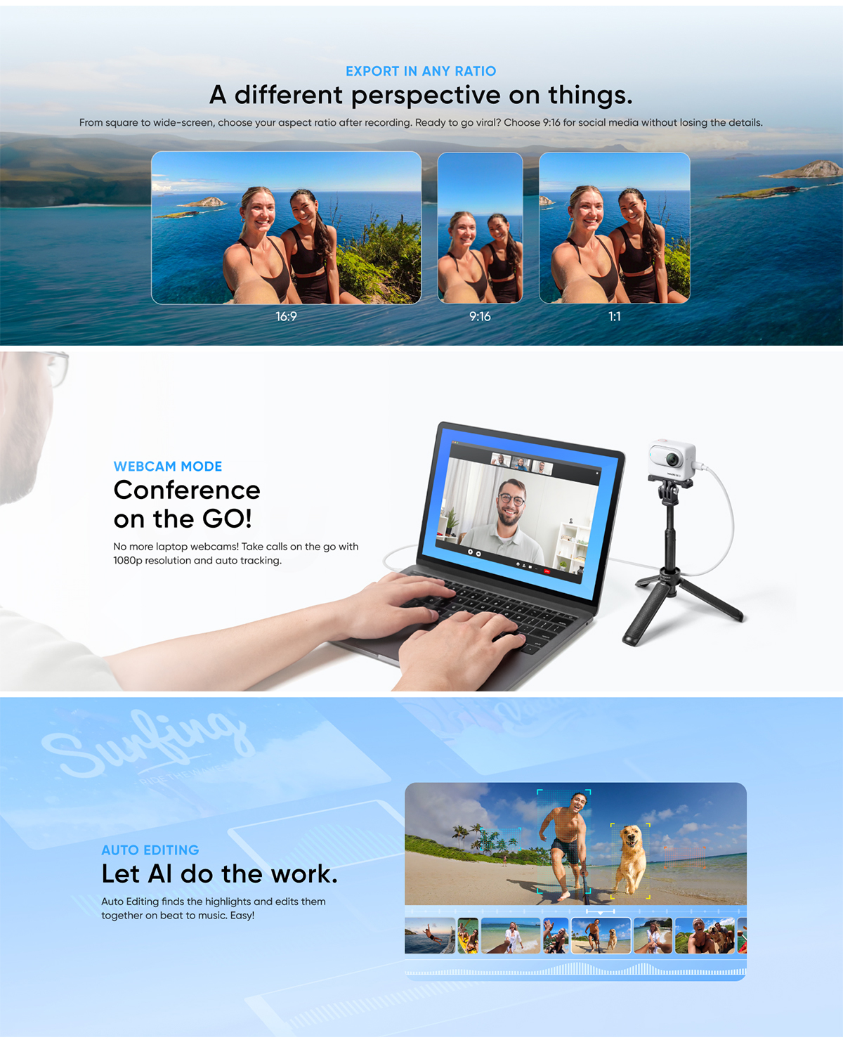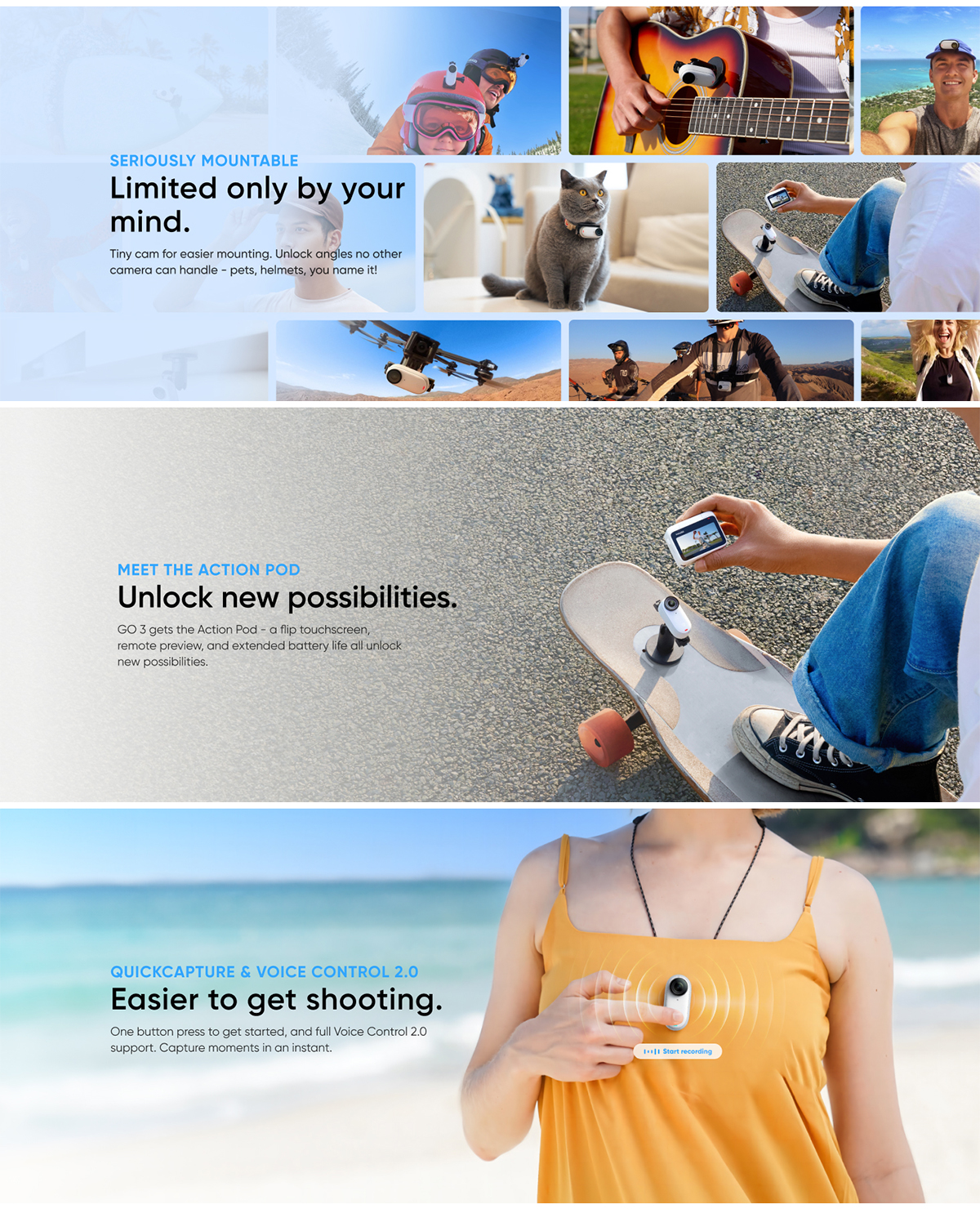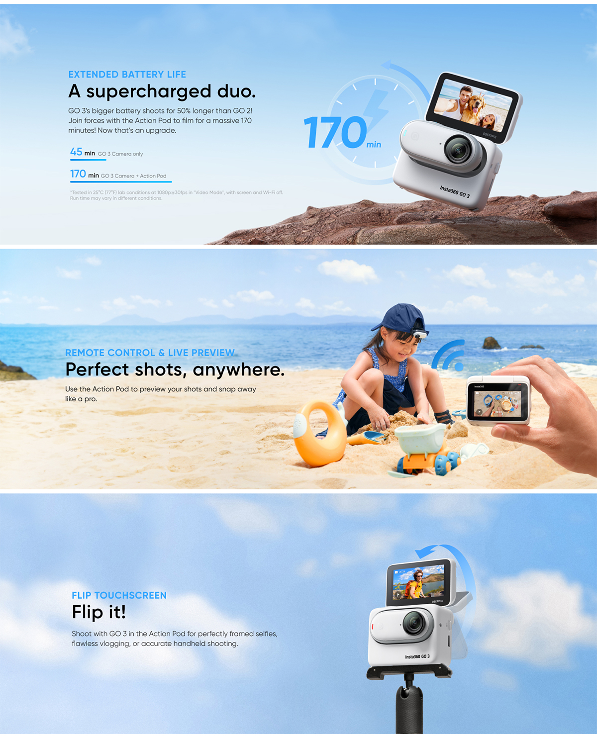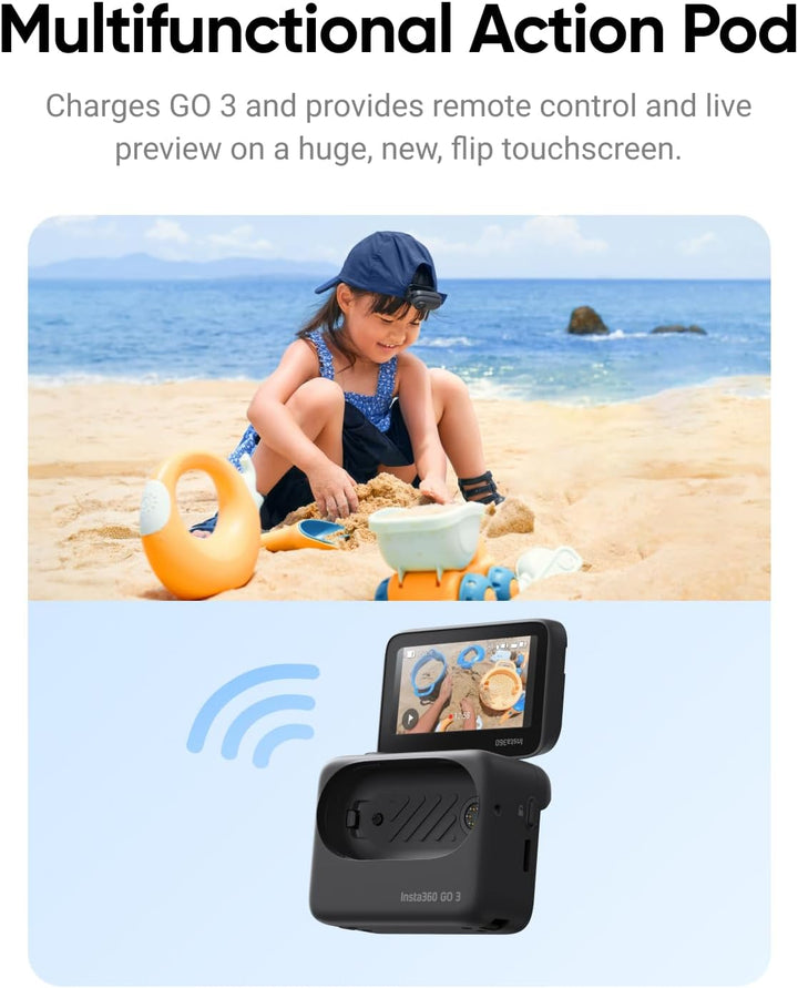 Action Pod charges GO 3 for up to 170 minutes battery life, plus offers remote control, live preview, and a flip touchscreen.