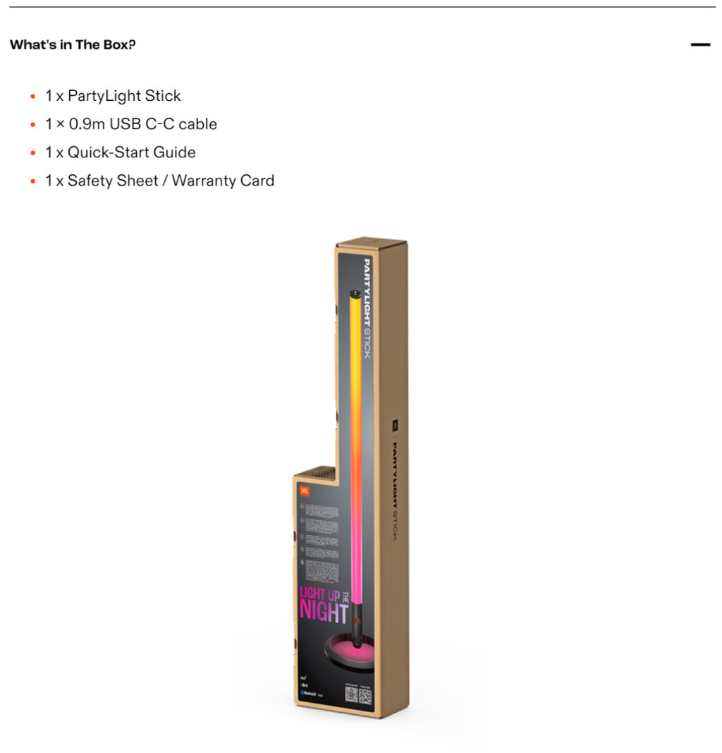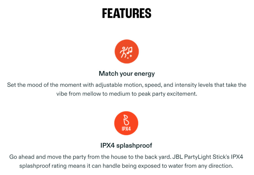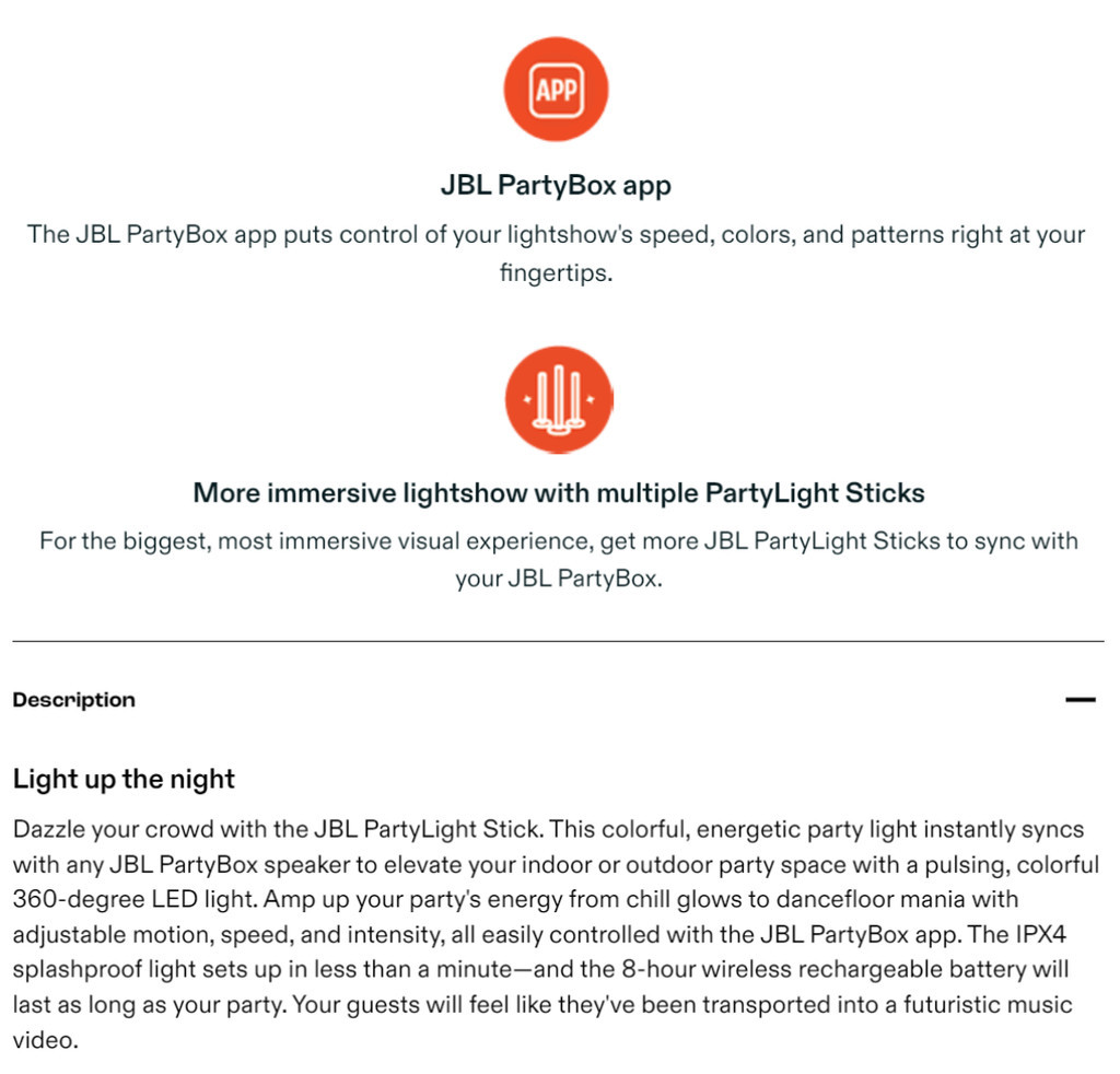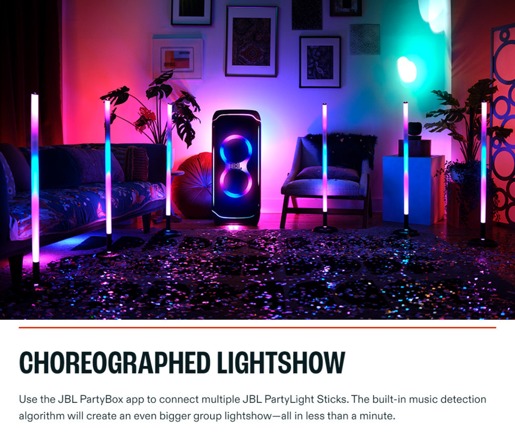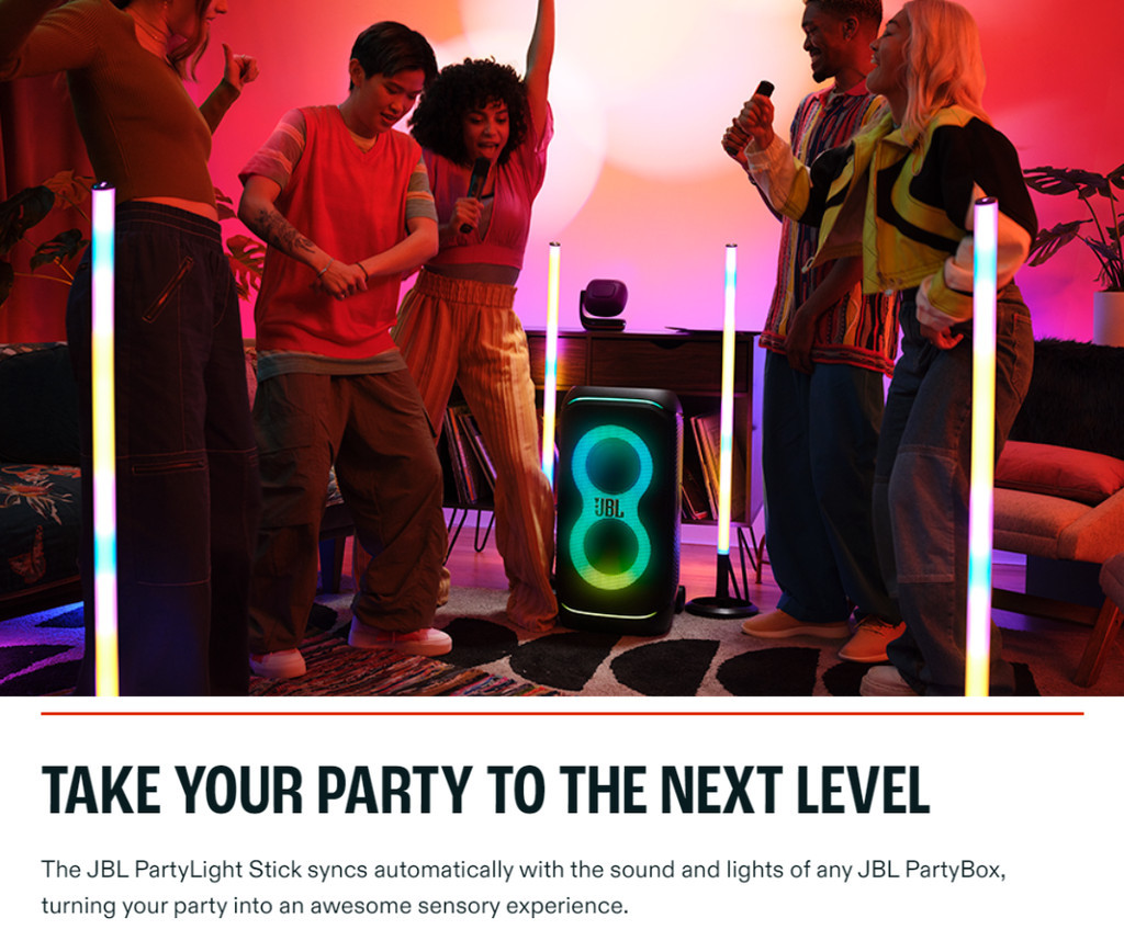 Dazzle your crowd with the JBL PartyLight Stick. This colorful, energetic party light instantly syncs with any JBL PartyBox speaker to elevate your indoor or outdoor party space with a pulsing, colorful 360-degree LED light. Amp up your party’s energy from chill glows to dancefloor mania with adjustable motion, speed, and intensity, all easily controlled with the JBL PartyBox app. The IPX4 splashproof light sets up in less than a minute—and the 8-hour wireless rechargeable battery will last as long as your party. Your guests will feel like they’ve been transported into a futuristic music video.