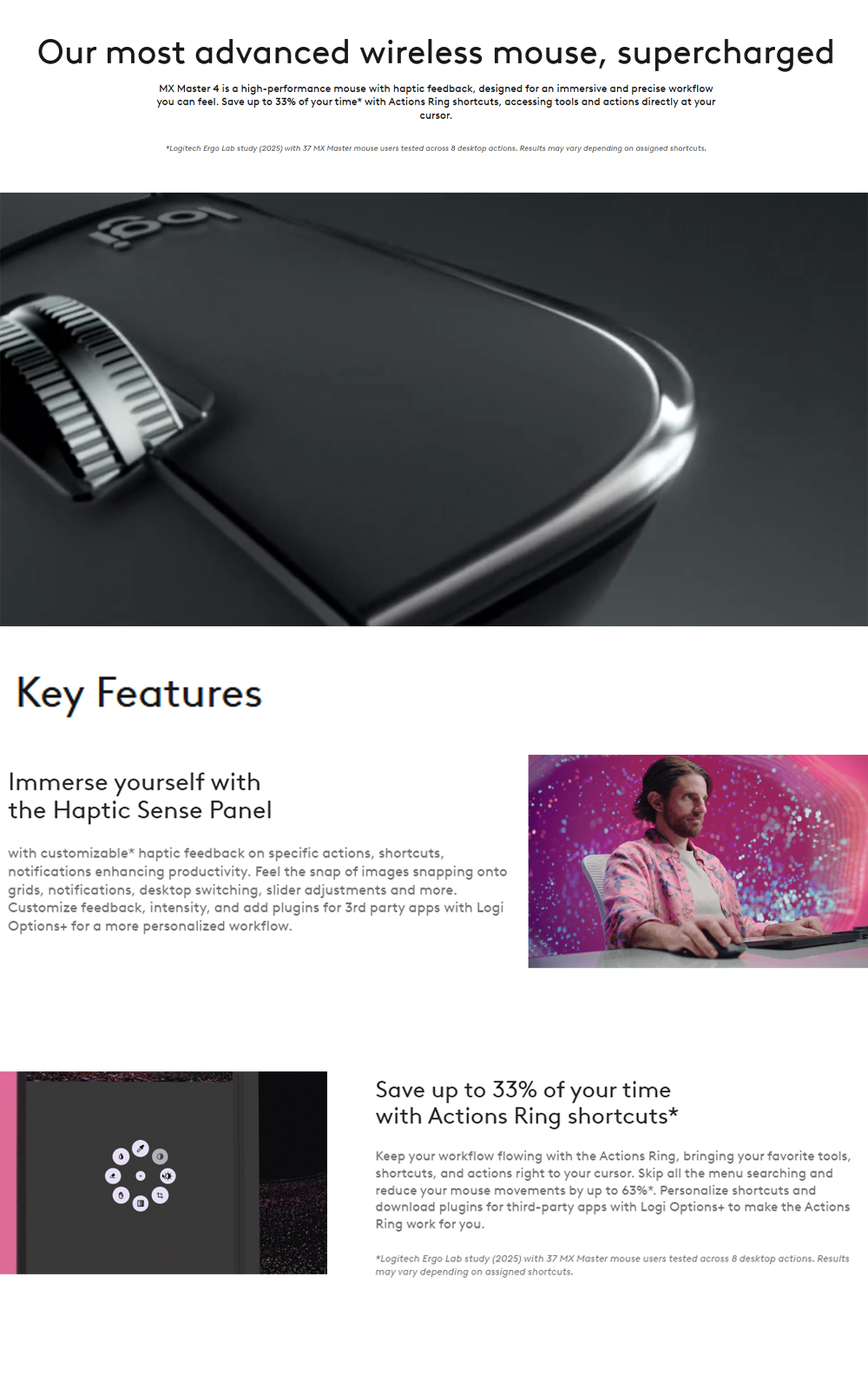 Meet the MX Master 4 that brings immersive control and precision you can feel with customizable haptic feedback on specific actions.
