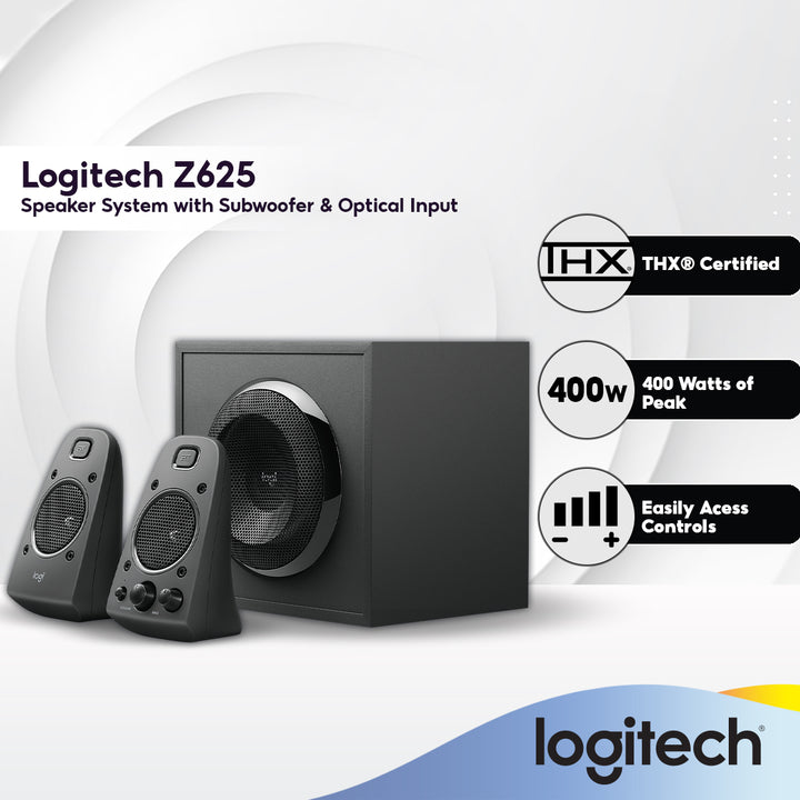 Speaker System with Subwoofer and Optical Input. This THXยฎ Certified 2.1 speaker system delivers gaming grade audio and the ultimate sound experience for your movies and music. 400 Watts of Peak/200 Watts RMS power delivers crisp sound and thundering bass.