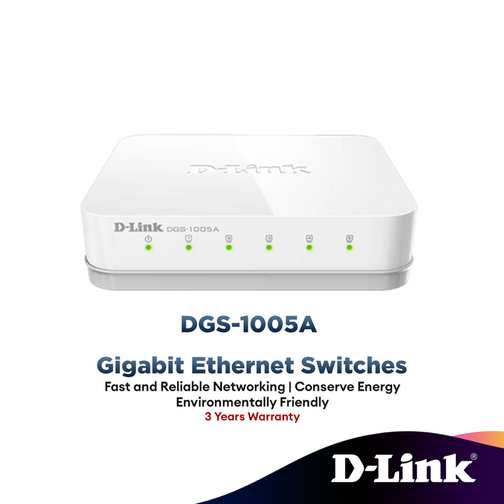 The D-Link 5-Port Gigabit Unmanaged Desktop Switch creates a blazing fast network for your office, as its Gigabit Ethernet ports provide high-speed wired connections for up to five PCs or other devices. The DGS-1005A also features QoS, which prioritizes network traffic so that time-sensitive data is delivered efficiently, even during bursts of high data traffic.