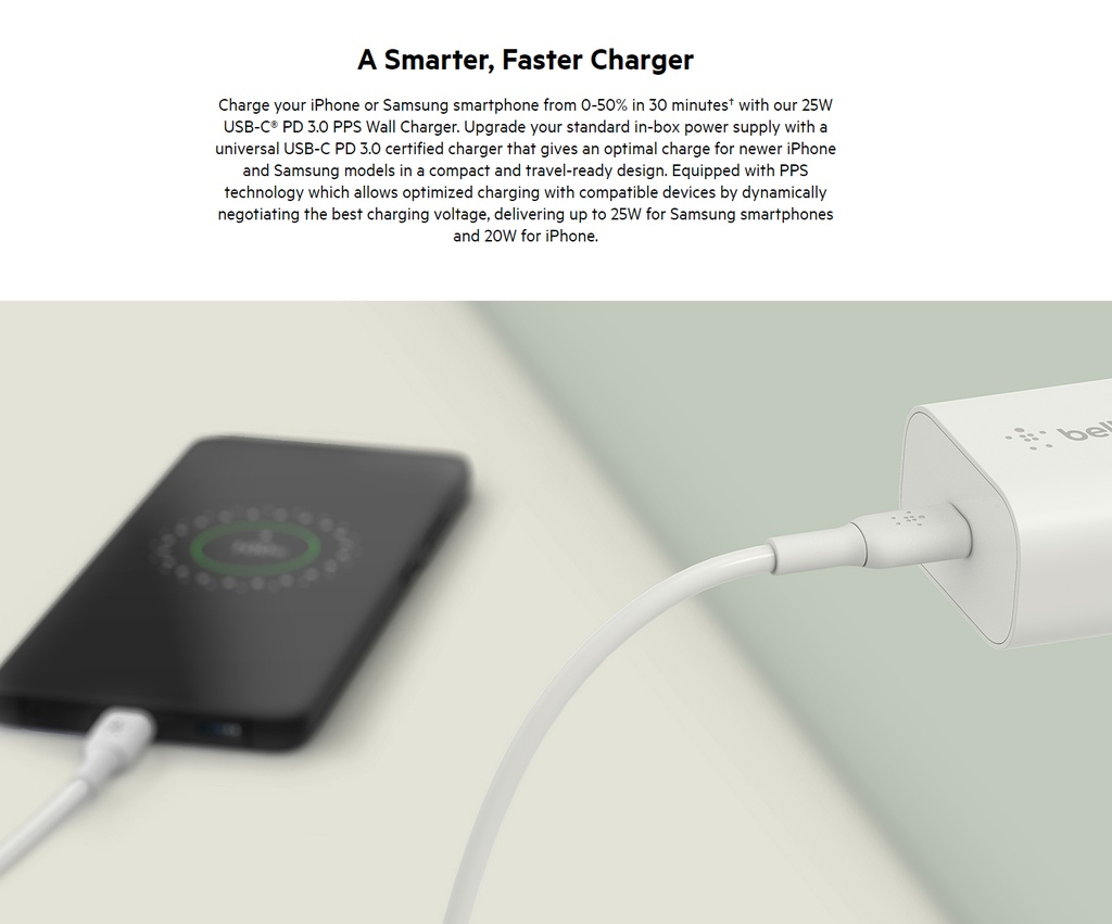 • Dynamic power delivery with PPS technology delivers up to 25W for Samsung smartphones and up to 20W for iPhone