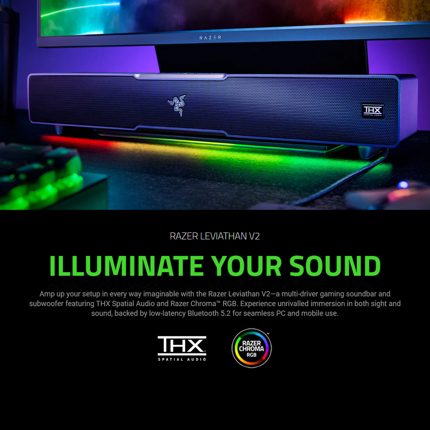 Amp up your setup in every way imaginable with the Razer Leviathan V2โa multi-driver gaming soundbar and subwoofer featuring THX Spatial Audio and Razer Chromaโข RGB.