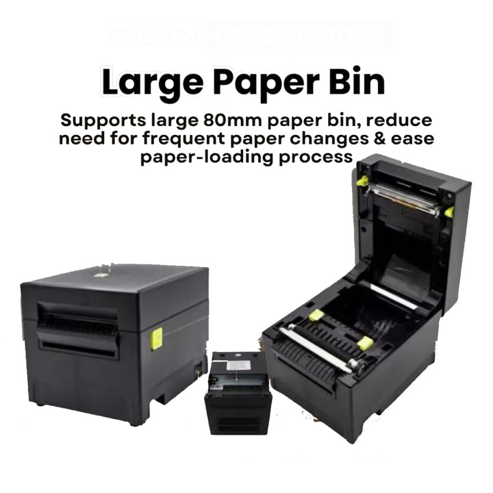 - Large paper bin capacity: The AN803 80mm Thermal Receipt Printer is equipped with an extra-large paper bin (supporting up to 80mm width paper), which can accommodate more thermal receipt paper, avoiding mid-term downtime or wasting time replenishing paper.