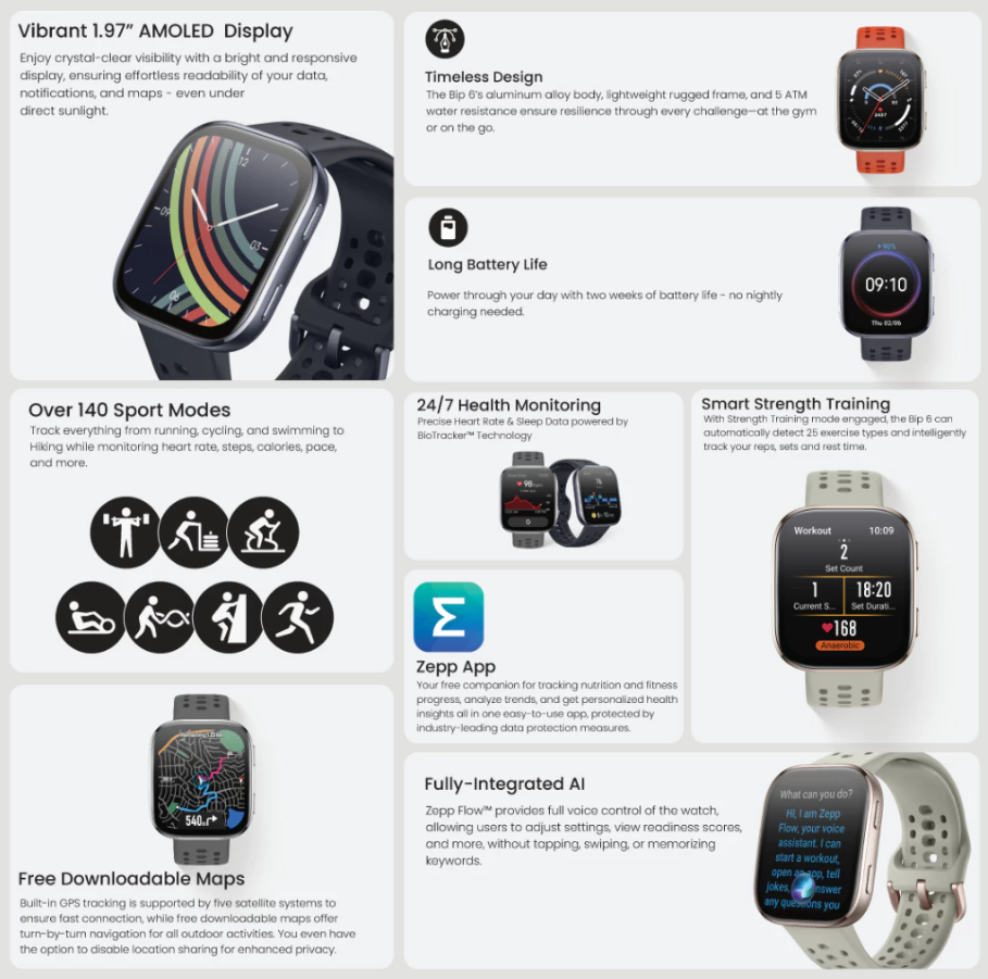 Amazfit Bip 6 Smart Watch [1.97-inch AMOLED / 24/7 BioTacker Technology / Zepp APP / Smart Strength Training]