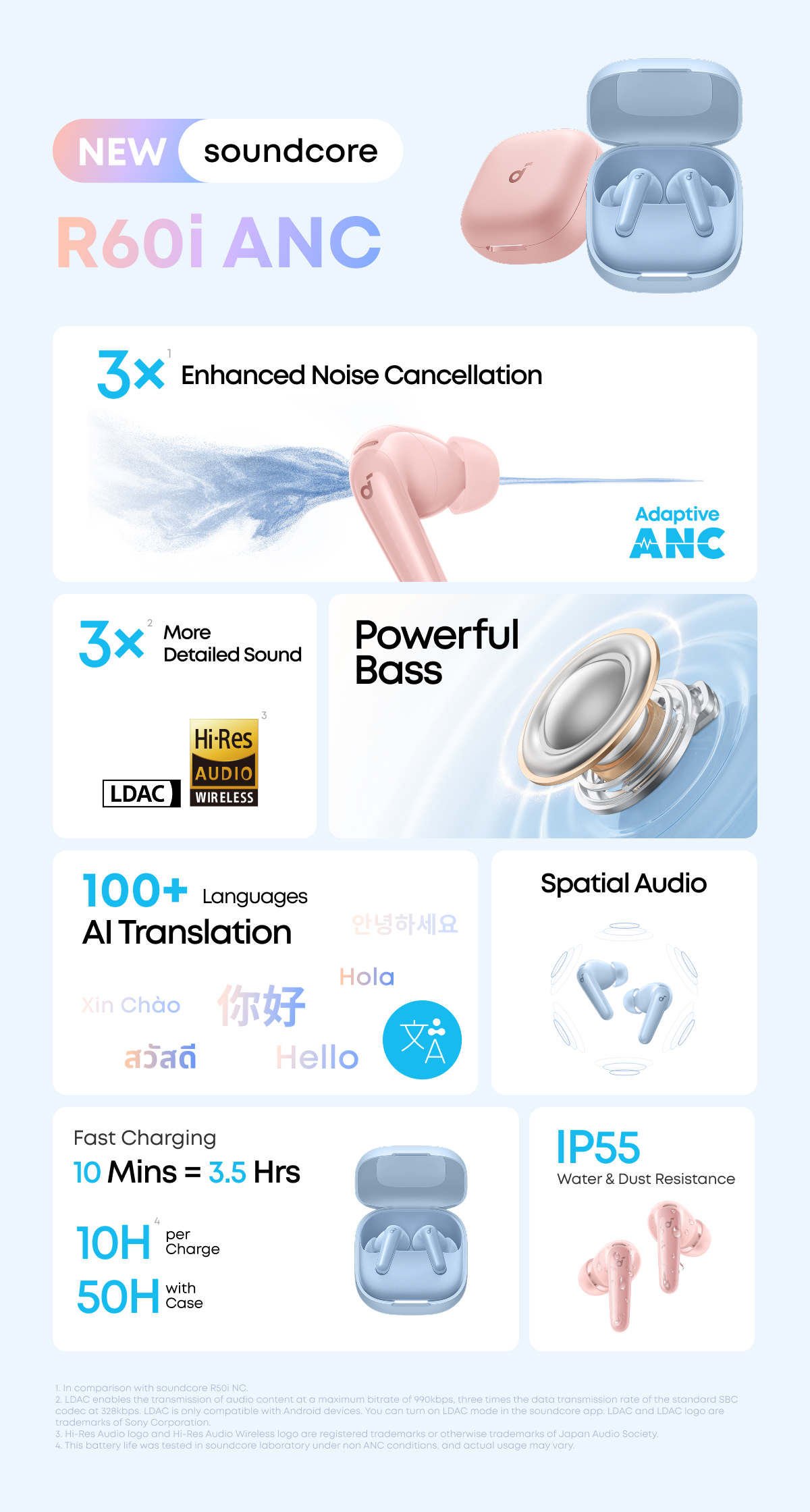 ]Soundcore R60i NC Wireless Earbuds -52dB Adaptive Noise-Cancelling Hi-Res Clarify Sound AI Assistant 50H Long Play Time