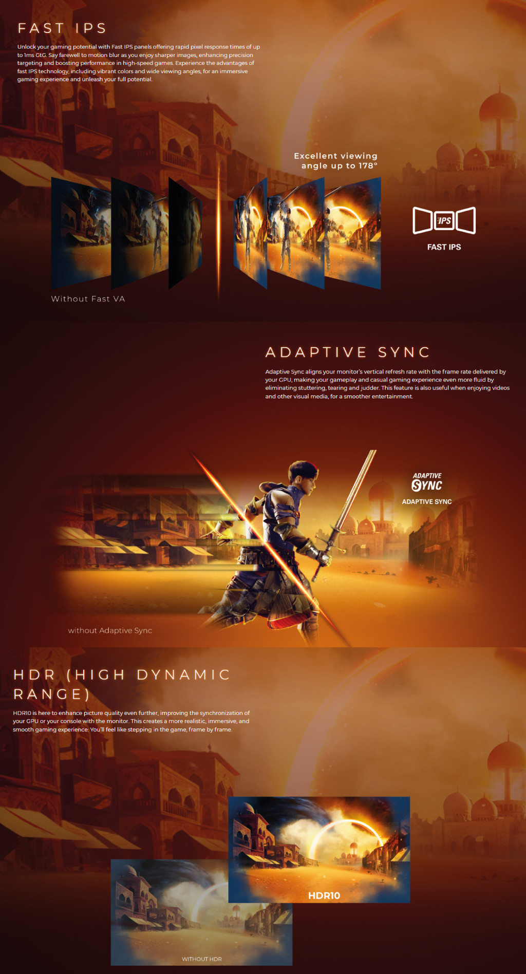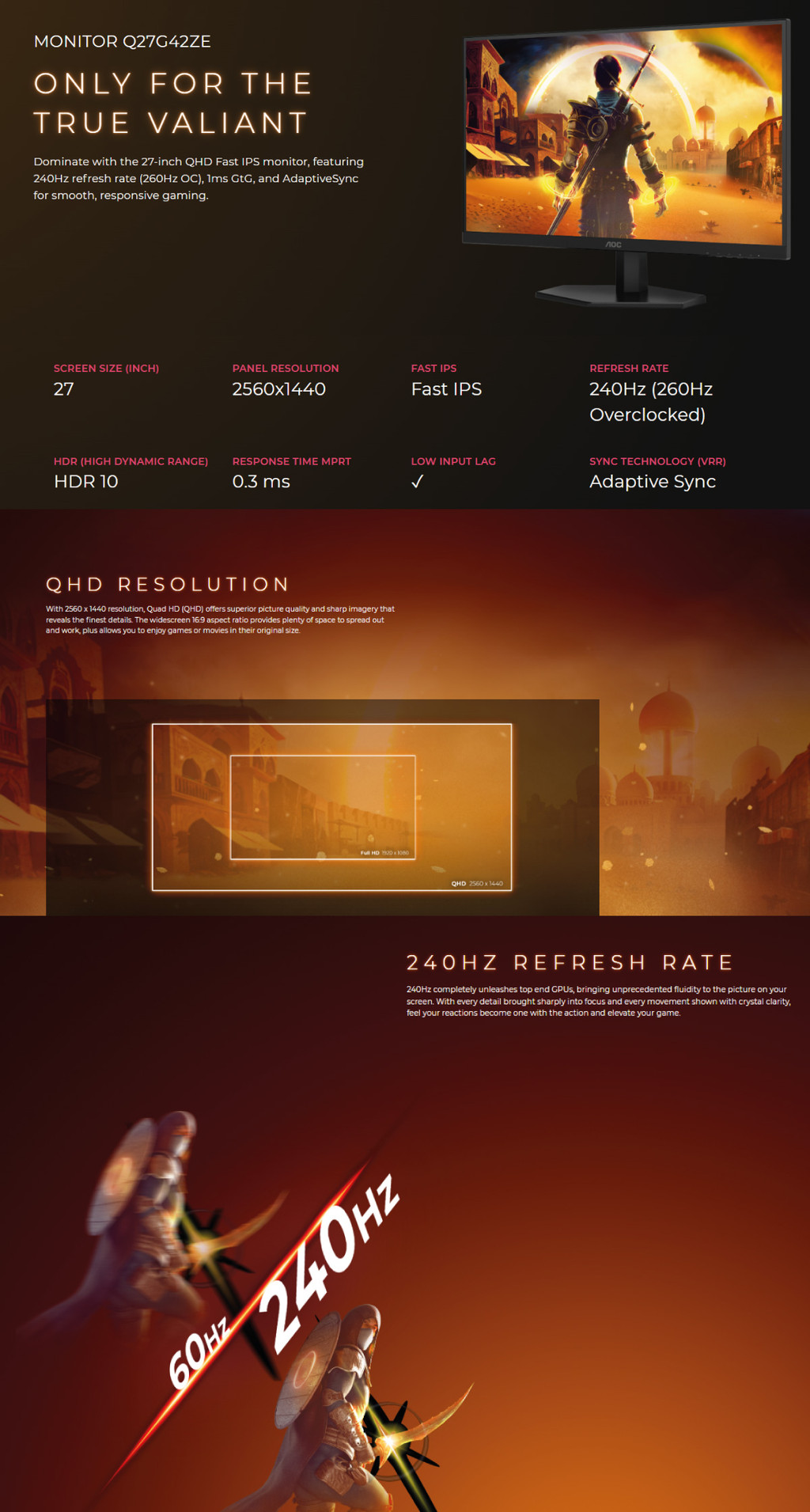 Dominate with the 27-inch QHD Fast IPS monitor, featuring 240Hz refresh rate (260Hz OC), 1ms GtG, and AdaptiveSync for smooth, responsive gaming.