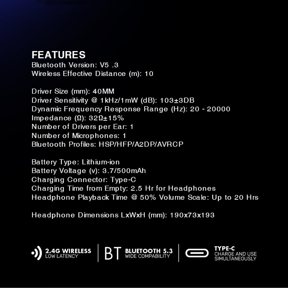 - Headphone Playback Time @ 50% Volume : Up to 20 Hours