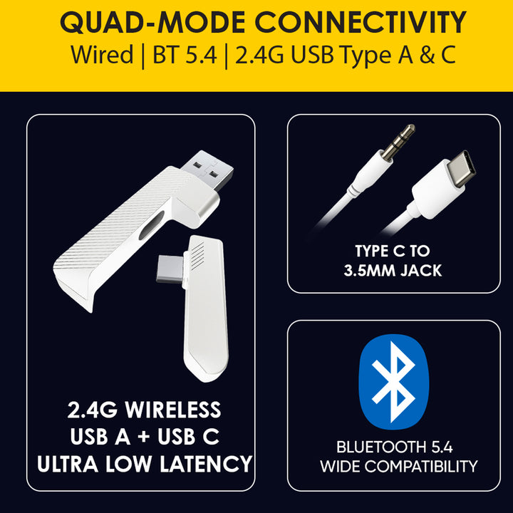 Quad-mode connectivity: Wired (AUX), USB Type-C, 2.4G dongle and Bluetooth—ideal for a variety of devices.