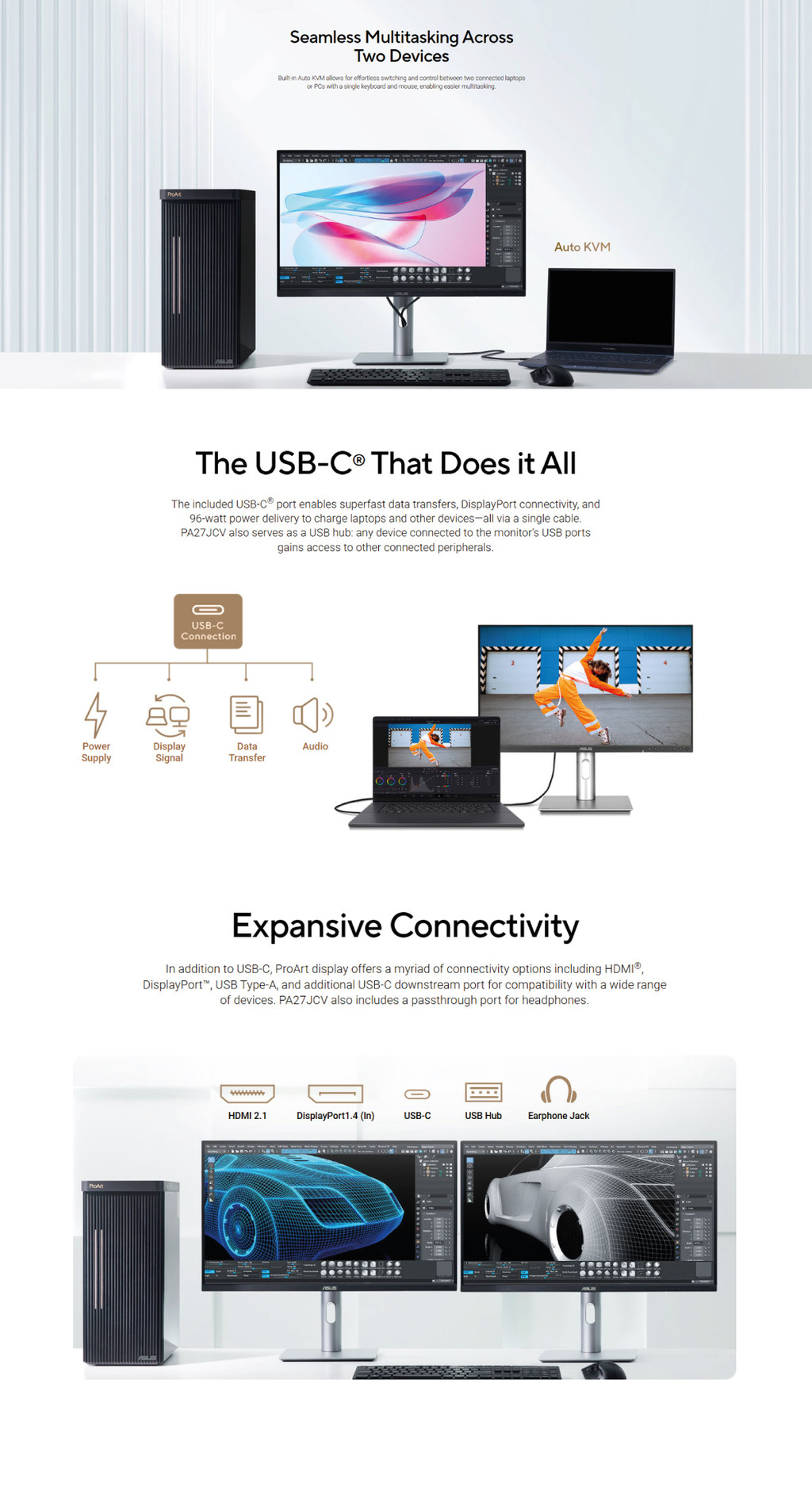 Built-in Auto KVM allows for effortless switching between two connected laptops or PCs with a single keyboard and mouse