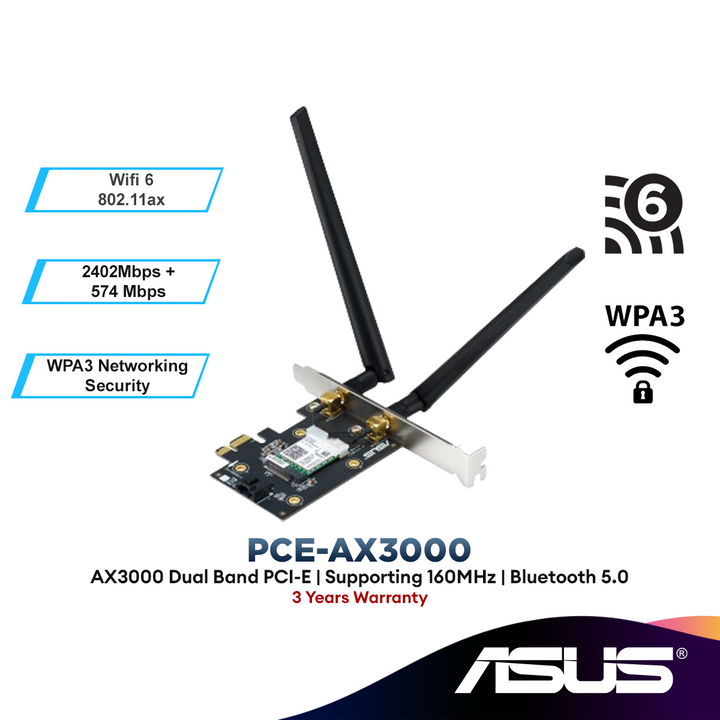 AX3000 Dual Band PCI-E WiFi 6 (802.11ax). Supporting 160MHz, Bluetooth 5.0, WPA3 network security, OFDMA and MU-MIMO