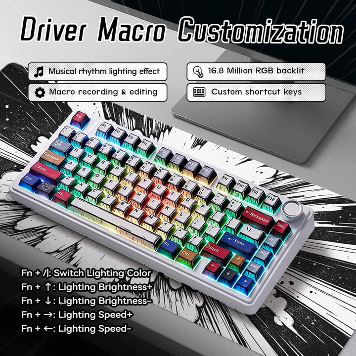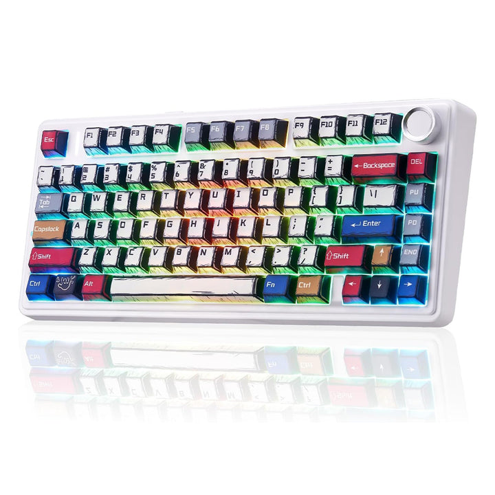 75 light up led keyboard features 16.8 million RGB lighting colors and 16 lighting effects, you can change the color, brightness and speed by the knob or FN key combination, creating a desktop atmosphere to fit your mood