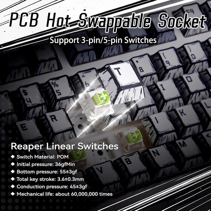 F75 gaming keyboards equipped with pre-lubricated stabilizers and LEOBOG reaper switches, brings you smooth typing feeling and pleasant creamy sound, and provides fast response for exciting game. With hot-swappable base