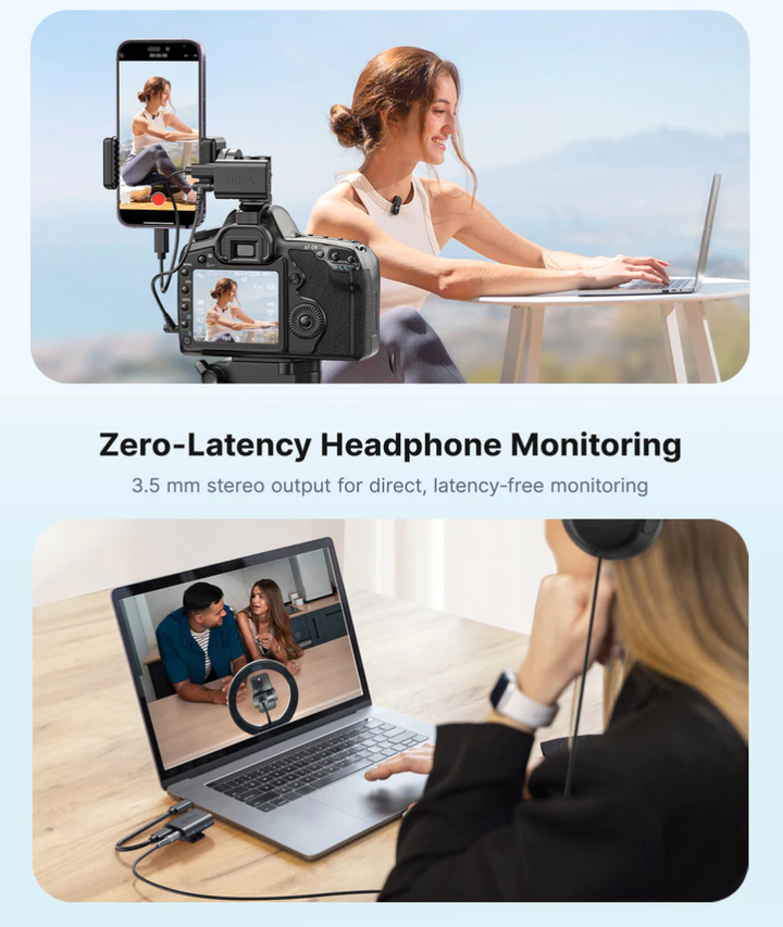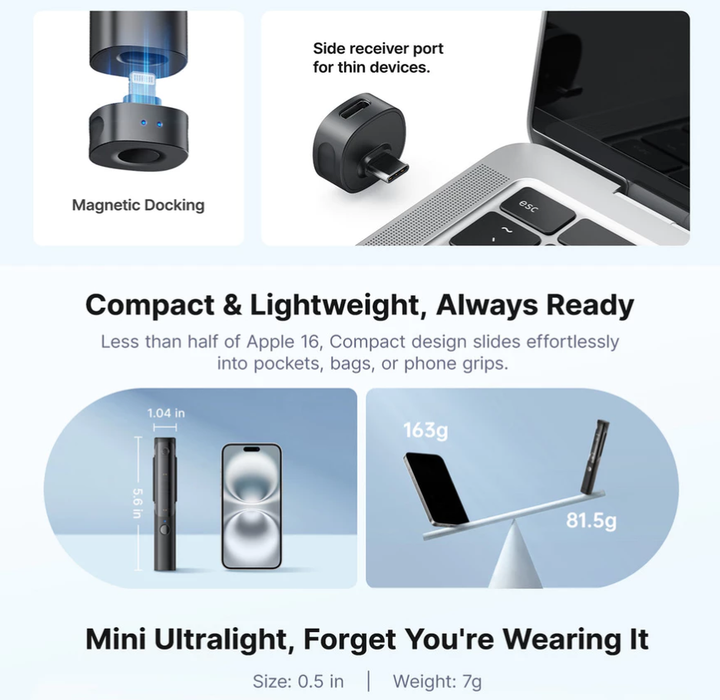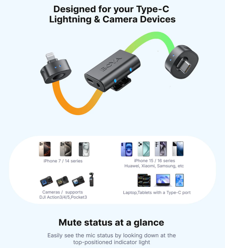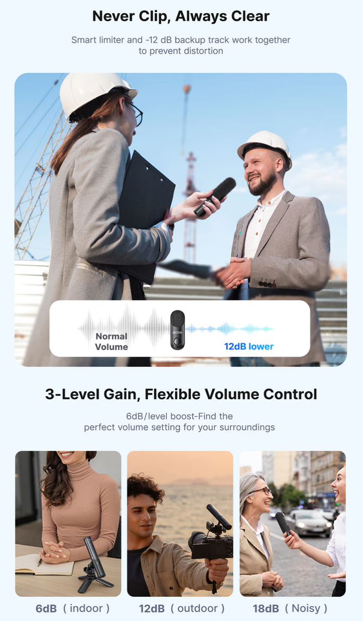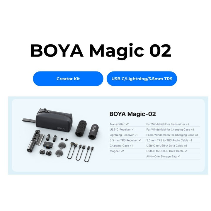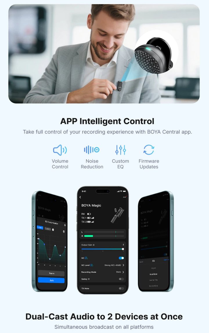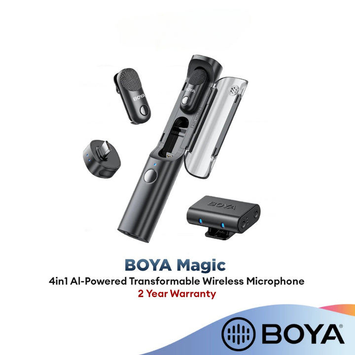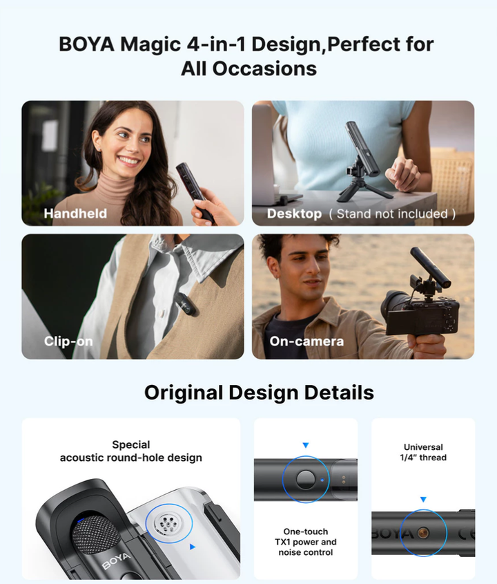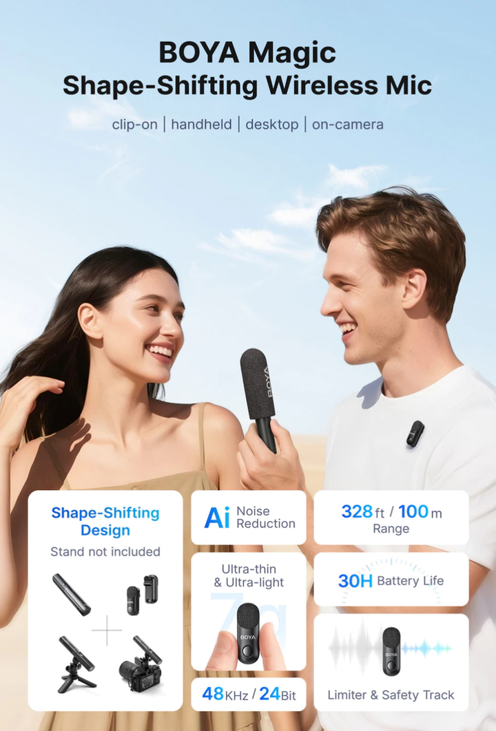 Switch seamlessly between wireless lavalier (perfect for vlogging), handheld interview stick (ideal for street reporting), desktop mic (crisp podcasting), and On-Camera (cinematic audio). No extra equipment, no wasted time.BOYA MAGIC Wireless Microphone – 1 Mic, 4 Styles, All Scenes With EaseMic serba guna yang direka khas untuk content creator, vlogger, podcaster dan interviewer.