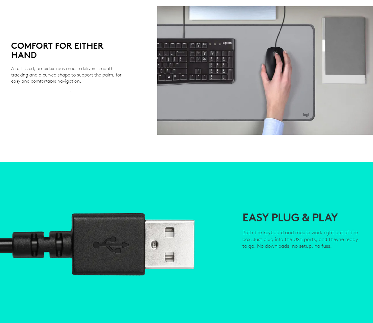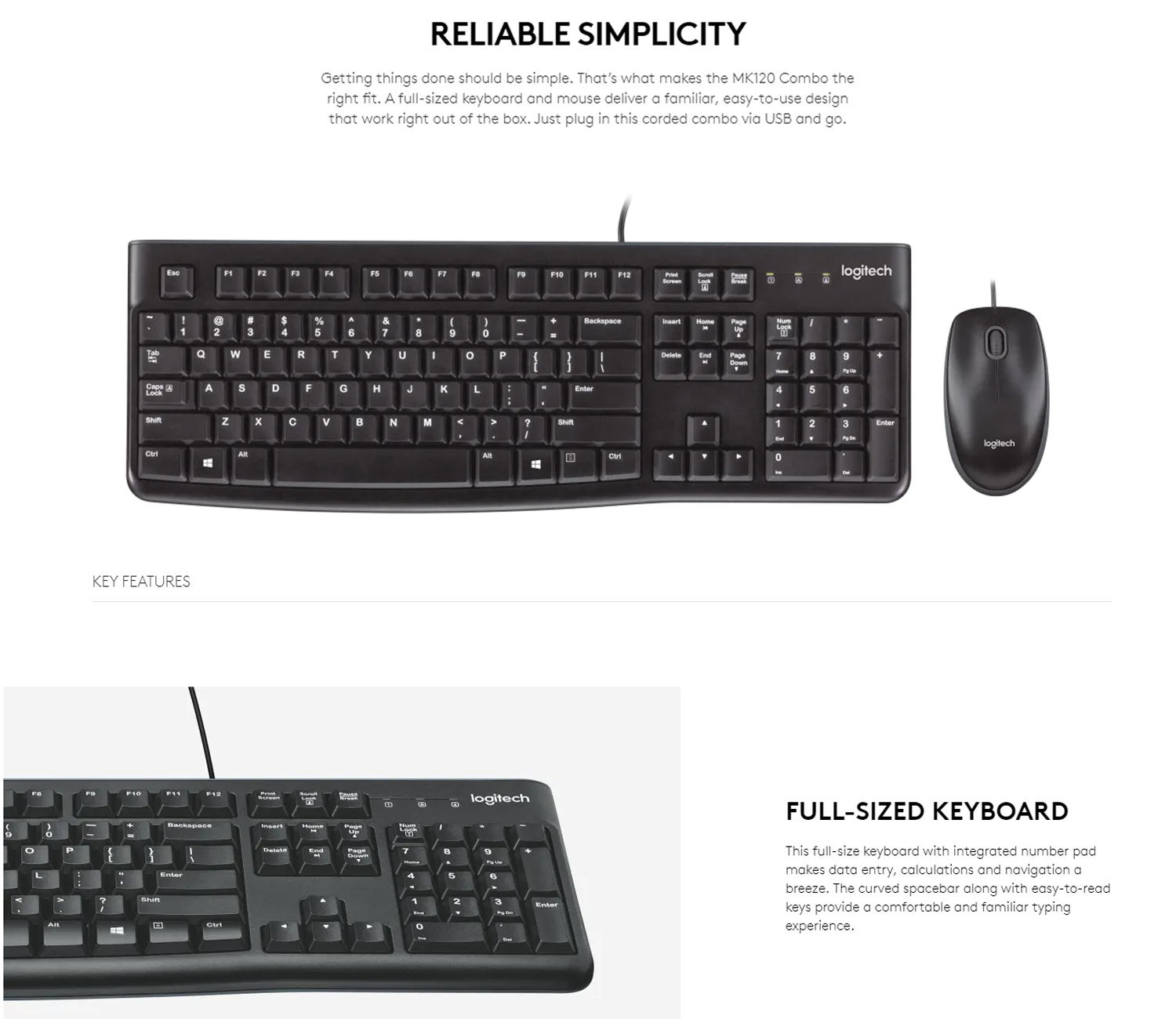 A full-sized keyboard and mouse deliver a familiar, easy-to-use design that work right out of the box. Just plug in this corded combo via USB and go.