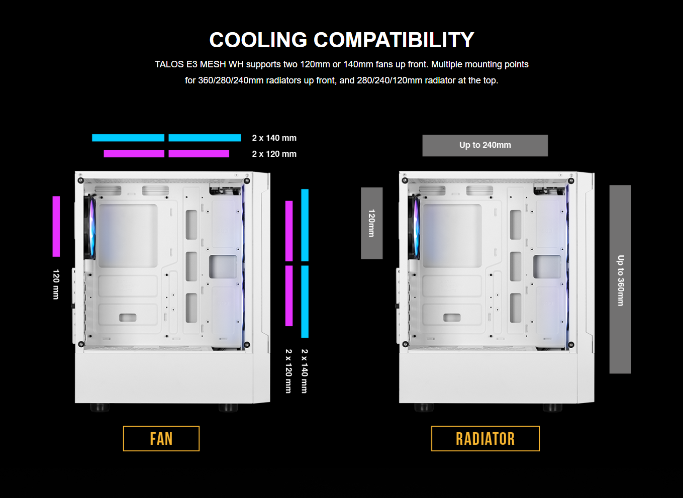 FRONT : 360mm ( HDD is removable to support 360 AIO in front ) // 280mm