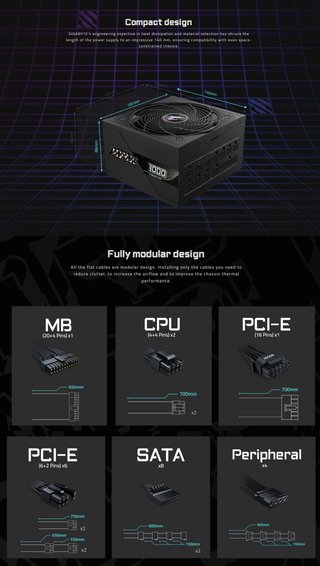 PCI-e 6+2 Pin x 6 : 650mm+150mm*2, 750mm*2