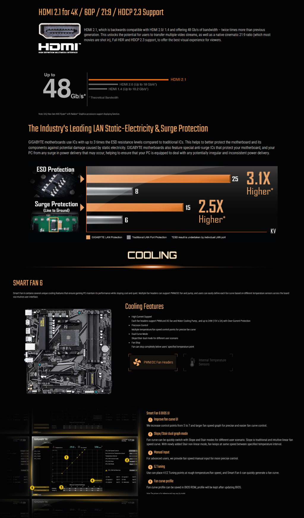 * Support for HDMI 2.1 version, HDCP 2.3, and HDR.