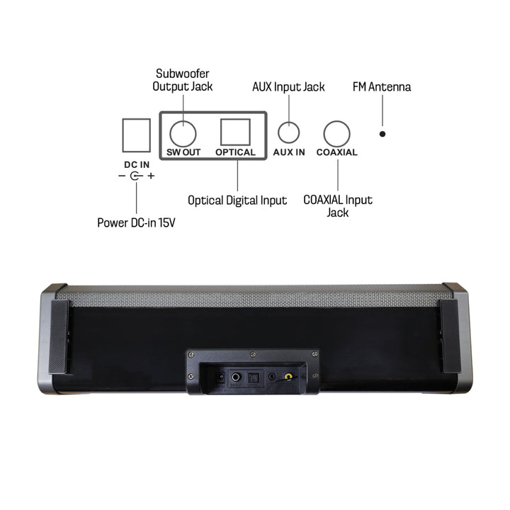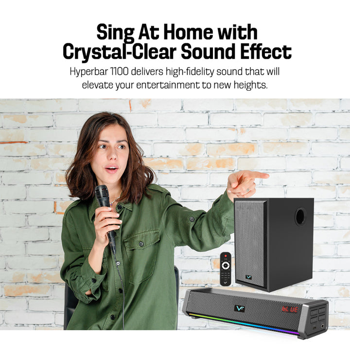 + Karaoke Capability: The VF Hyperbar 1100 is equipped with a microphone jack, making it ideal for karaoke enthusiasts. Connect a microphone and enjoy singing along to your favorite tunes with adjustable echo and volume controls. It provides an interactive and entertaining experience for gatherings and parties.