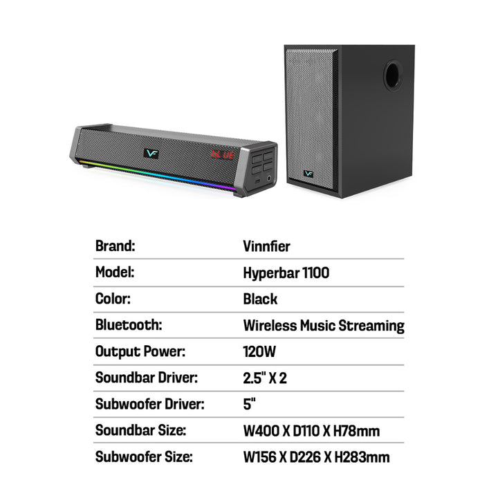 + Powerful Total System Power: With a total system power of 120W, the VF Hyperbar 1100 ensures a robust and dynamic audio experience. Whether you're watching movies, playing games, or listening to music, the system's high power output enhances the overall sound performance.