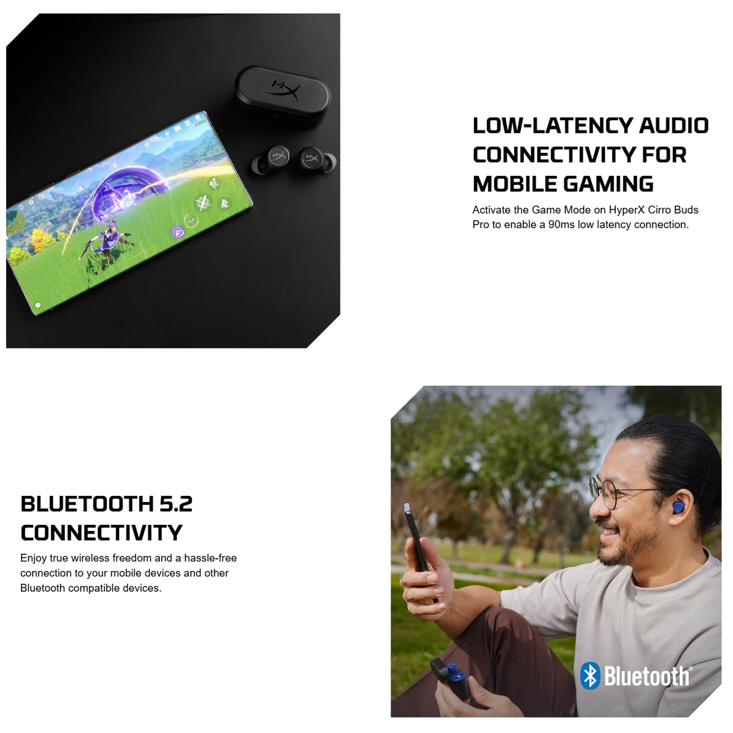 Low-Latency Audio Connectivity for Mobile Gaming: Activate the Game Mode on HyperX Cirro Buds Pro to enable a 90ms low latency connection.