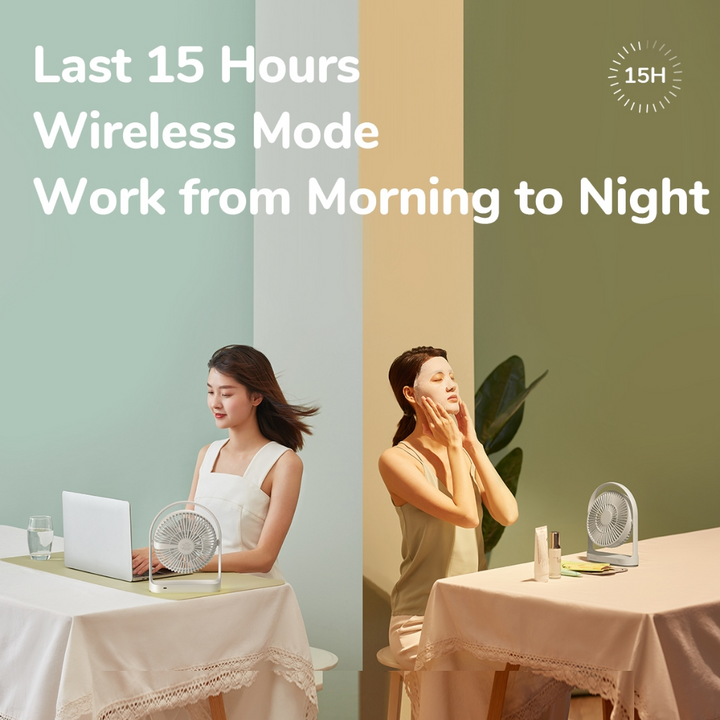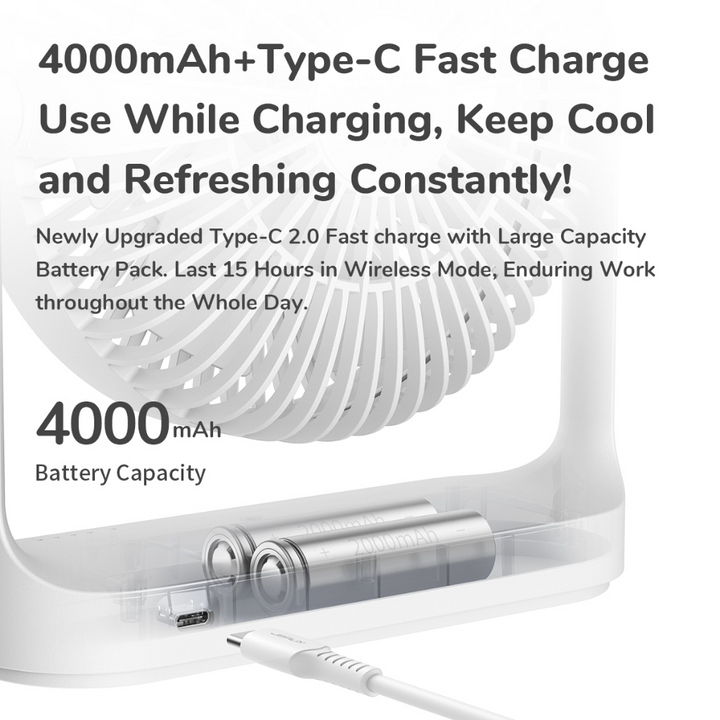 JISULIFE desk fan powered by 4000mAh rechargeable battery, which can work continuously 5-15h depending on the wind speeds. Type C 2.0 fast charge, full charge takes 3-4 hours, 2X faster than the rest, can also be used while charging.