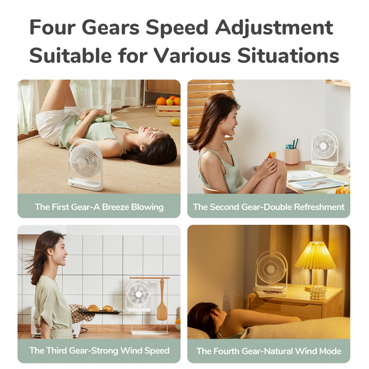 The first gear–A breeze blowing, the second gear–Double refreshment, the third gear-Strong wind speed, the fourth gear–Natural wind mode.