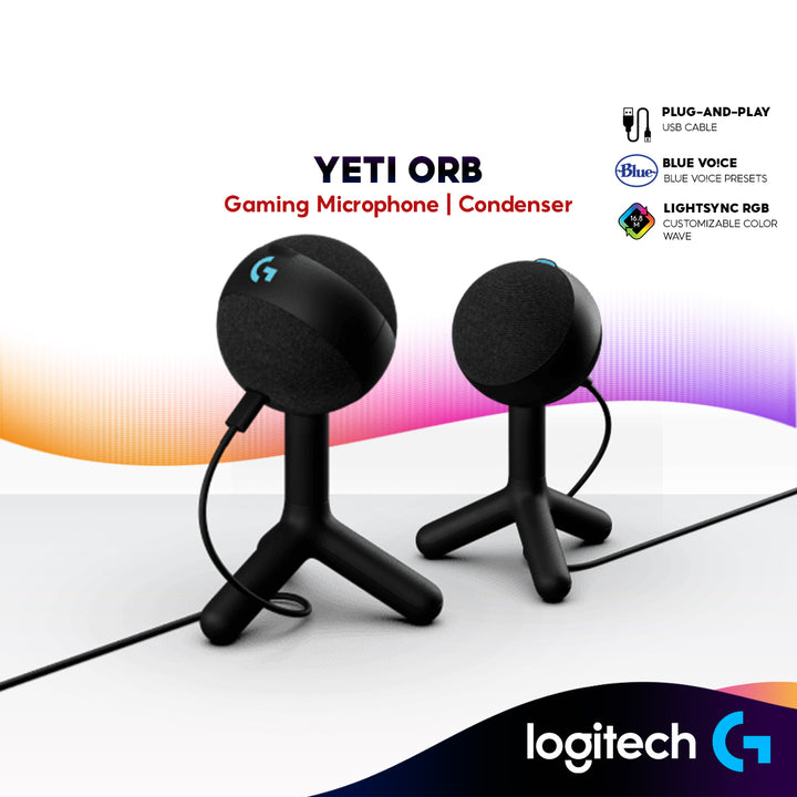 Logitech G Yeti Orb is a premium gaming microphone with LIGHTSYNC RGB, a condenser capsule optimized for game streaming, and Blue VO!CE presets that delivers best-in-class audio performance and ease of use via a simple USB connection.