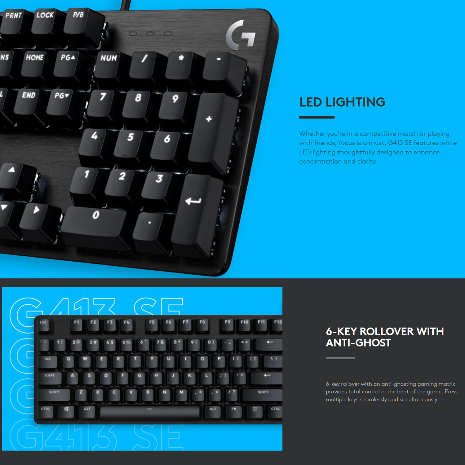 G413 TKL SE features tactile mechanical switches, 6-key rollover anti-ghosting, PBT keycaps and durable aluminum alloy buildโall in a tenkeyless design.