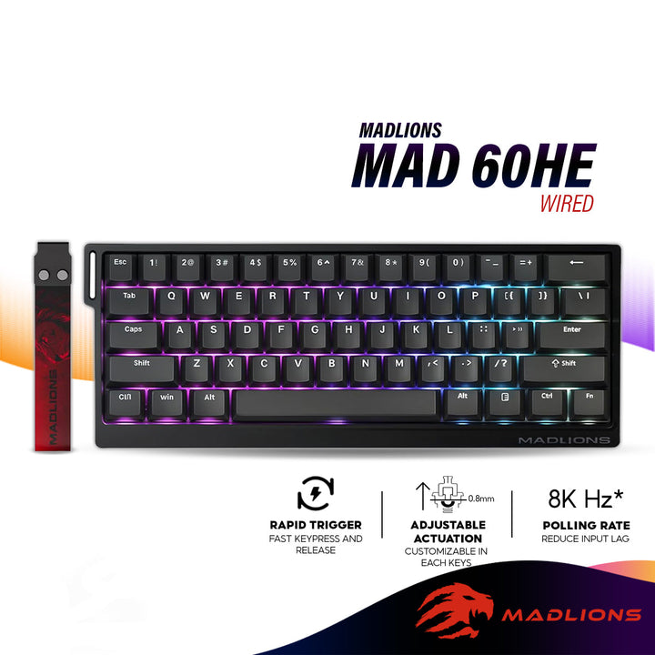 Enhance your gaming experience with the MADLIONS MAD60HE /68HE gaming magnetic switch keyboard. This keyboard is designed for high performance, featuring high-performance magnetic switches, making it an ideal choice for gamers and everyday users alike. Whether you are looking for the best gaming keyboard, a silent keyboard, or an efficient office keyboard, the MAD60HE meets your needs.