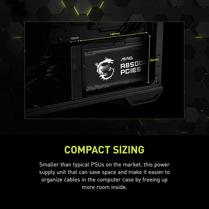Silent Operation: Featuring a 120mm fluid dynamic bearing (FDB) fan, the MAG A850GL PCIE5 operates with minimal noise, ensuring an immersive computing experience without distracting fan acoustics.