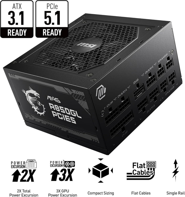 Elevate your PC's performance with the MSI MAG A850GL PCIE5 power supply. Designed to meet the rigorous demands of the latest hardware, this 850-watt 80 PLUS Gold certified PSU delivers highly efficient, stable, and reliable power for your high-performance gaming rig or workstation, including the power-hungry NVIDIA GeForce RTX 40 series graphics cards.