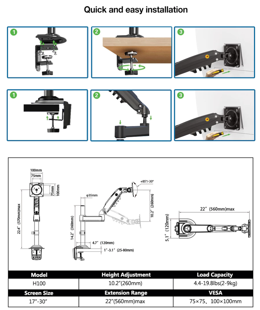 H100 is an ergonomics interactive display bracket that would ease-of-use in display adjustment. Built-in with ultra-precision gas-strut, once the weight adjustment is set, provides the viewer with positioning his display for maximum ergonomic comfort to relieve eye, neck, and back strain. Re-position your display with just a touch. Up. Down. Forward. Back offered an unparalleled range of motion. Push away and free up a table or desktop space when not in use. Enjoy viewing and gaming by the rotate display to portrait or landscape positions to increase productivity.
