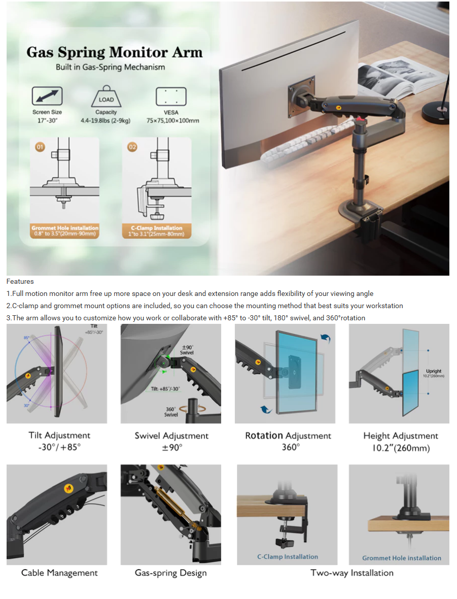 NB North Bayou H100 17"-30" Inch Gas Strut Single Arm Monitor Desk Mount