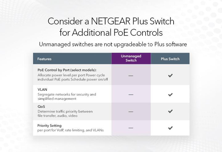 8 PoE+ ports with 60W total power budget, and includes NETGEAR FlexPoE making it expandable to 90W or even 130W (w/separately purchased power supply modules)
