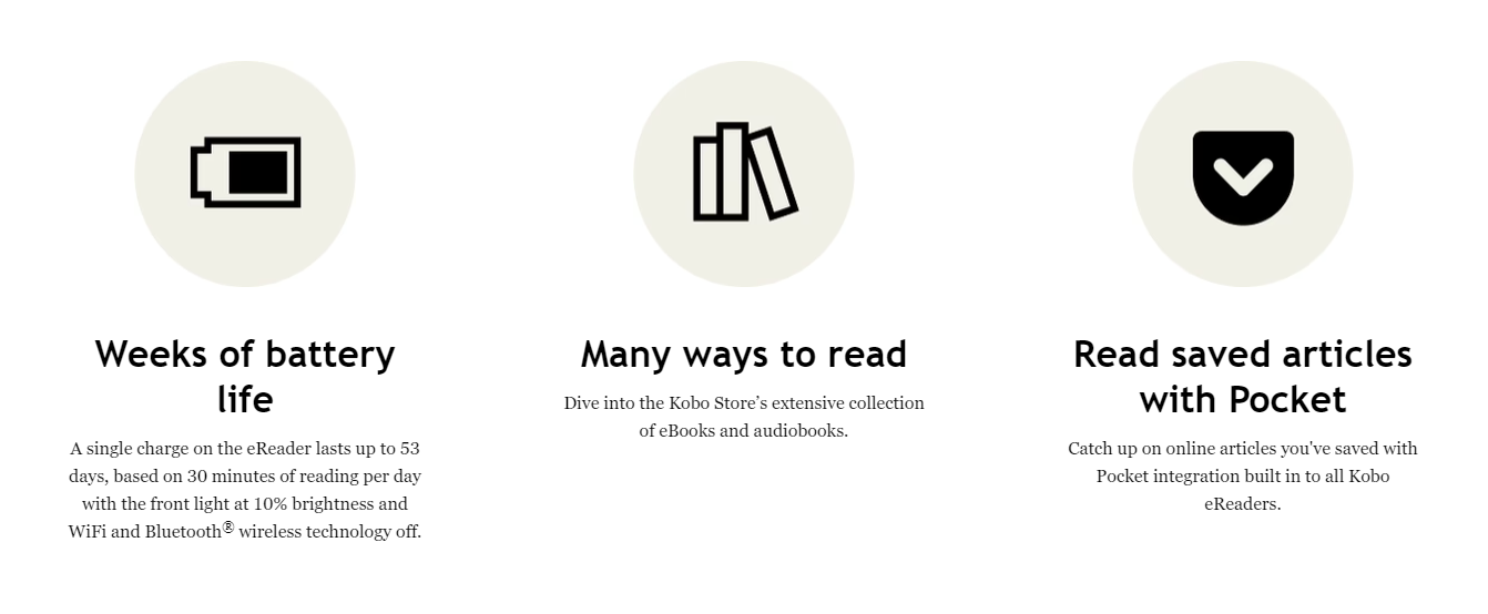 *A single charge on the eReader lasts up to 53 days, based on 30 minutes of reading per day with the front light at 10% brightness and WiFi and Bluetooth® wireless technology off.
