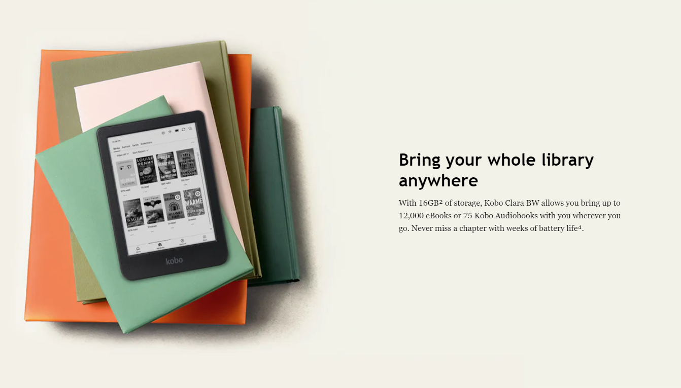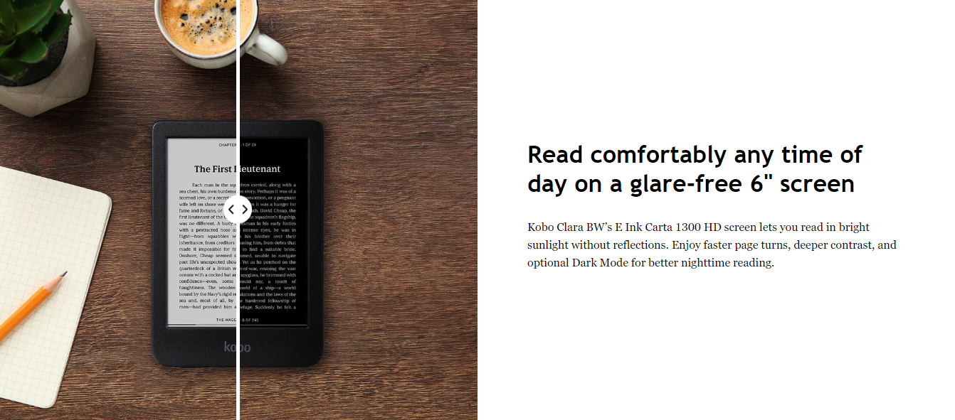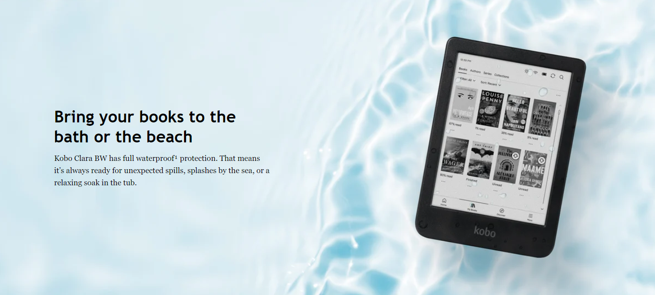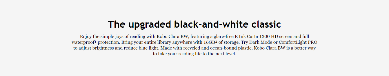 Enjoy the simple joys of reading with Kobo Clara BW, featuring a glare-free E Ink Carta 1300 HD screen and full waterproof¹ protection. Bring your entire library anywhere with 16GB² of storage. Try Dark Mode or ComfortLight PRO to adjust brightness and reduce blue light. Made with recycled and ocean-bound plastic, Kobo Clara BW is a better way to take your reading life to the next level.