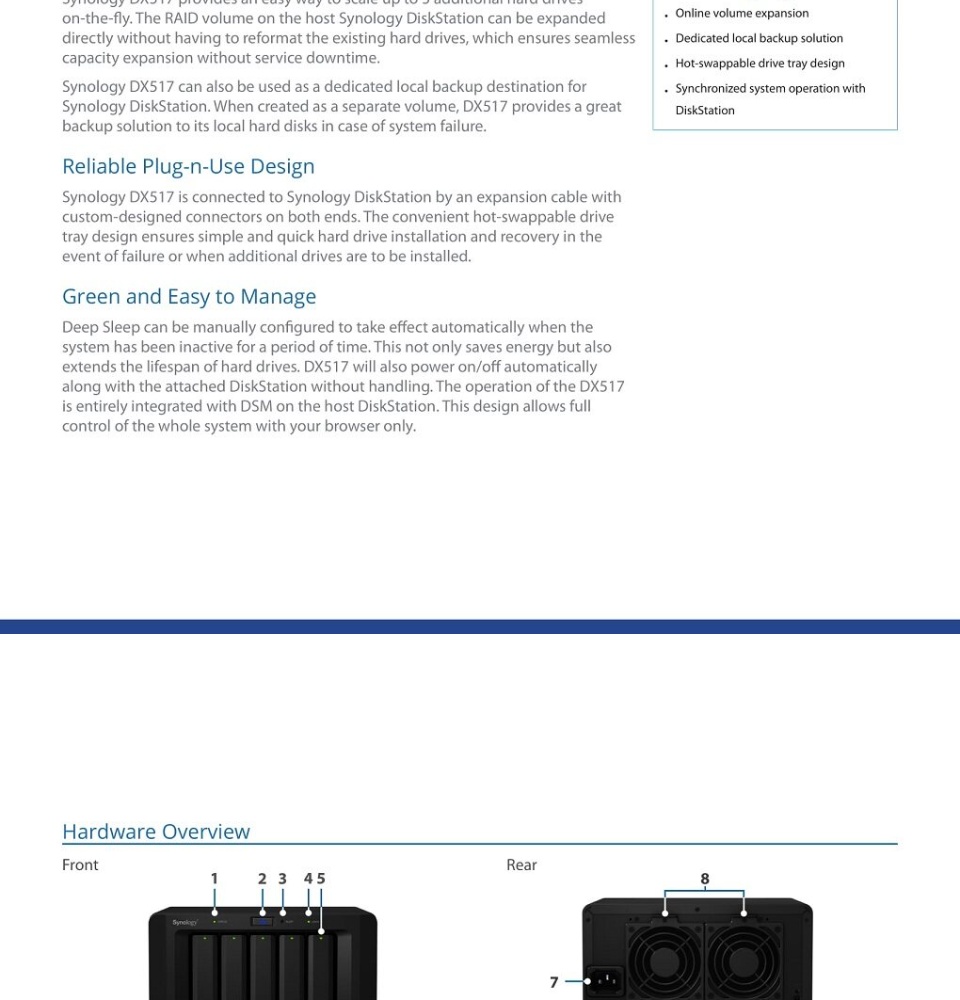 Synology DX517 can be used as a dedicated local backup solution for the Synology DiskStation. When created as a separate volume, the DX517 provides a great backup solution to its local hard disks in case of system failure.