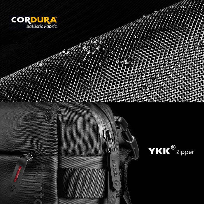The exterior is made of Cordura Ballistic Nylon. Incredibly sturdy, lightweight and water-resistant with heavy-duty durability.