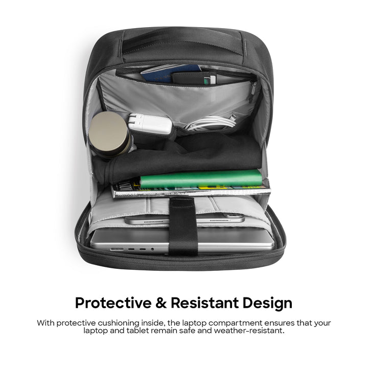 The laptop compartment is surrounded by thick protective padding, with soft, ultra-thick yet lightweight cushioning inside to keep your laptop or tablet safe from drops, bumps, dents, scratches, and spills, much like a car airbag.