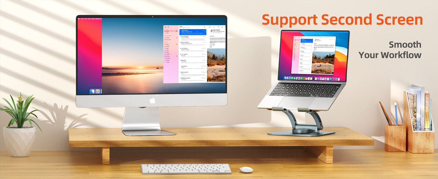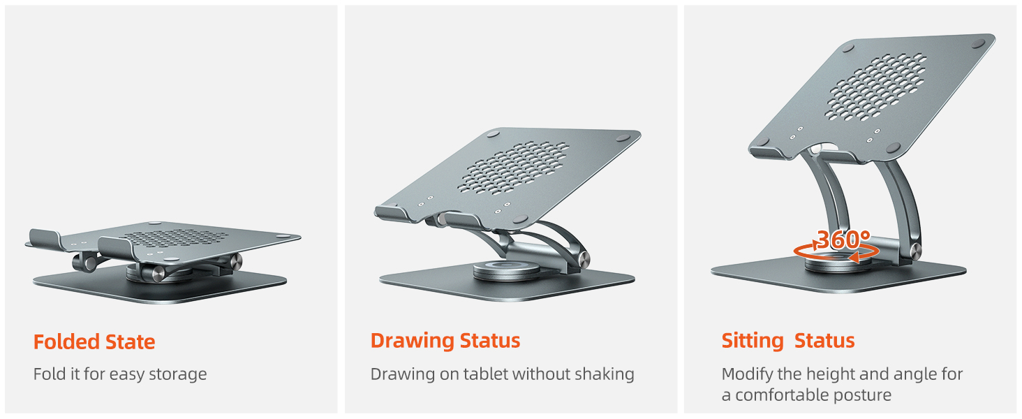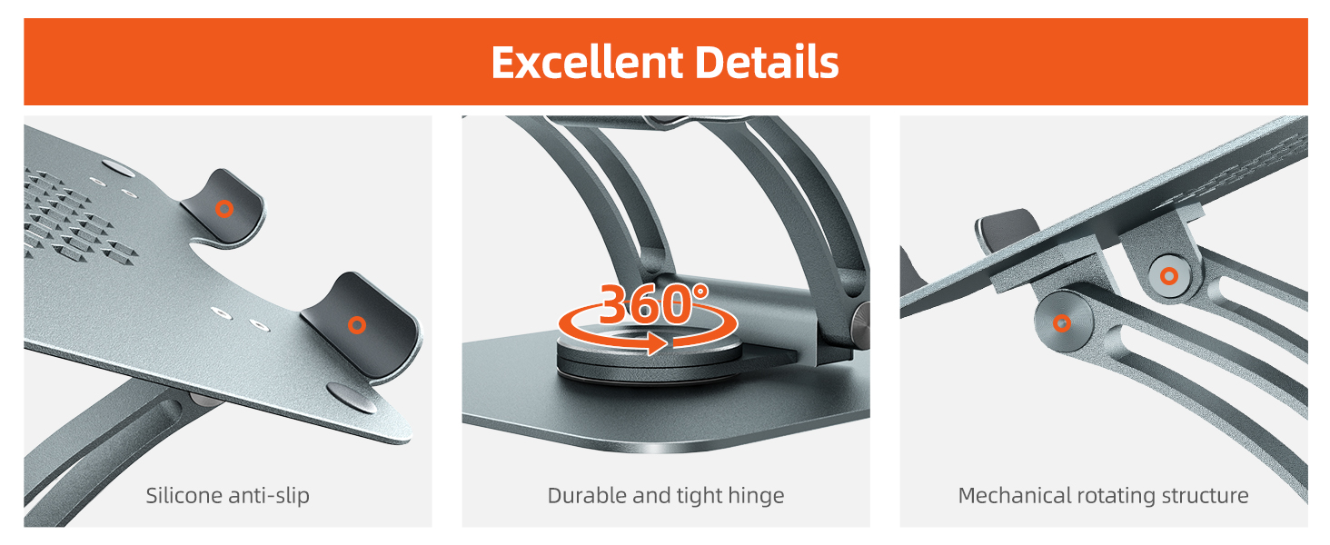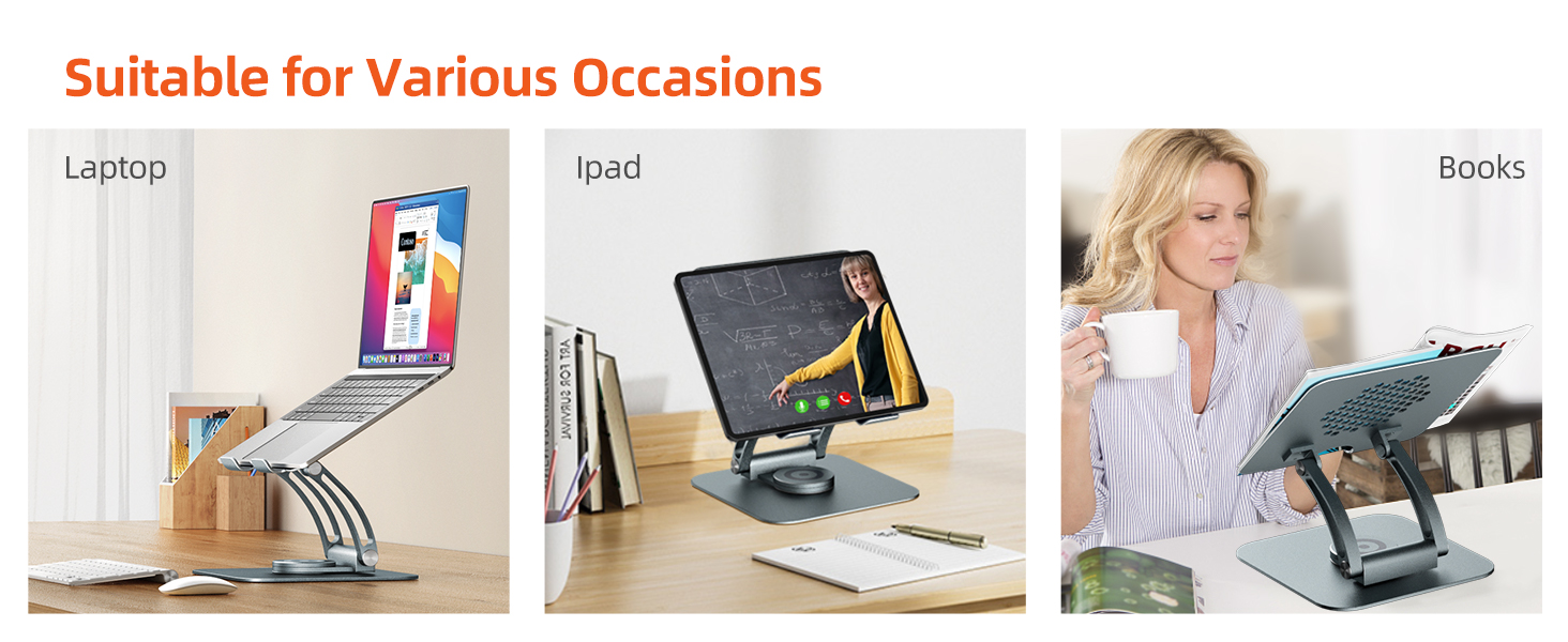360 Degree Rotation: Need to collaborate on a project? Our swivel laptop stand allows you to share your laptop screen with your work partner easily. This rotating laptop stand is the perfect solution for anyone who does a lot of video conferencing in different locations, environments & participants, and someone who works in an open office plan and wants to participate in meetings without leaving their workstation. This laptop stand for desk makes it possible for everyone to see the screen easily.