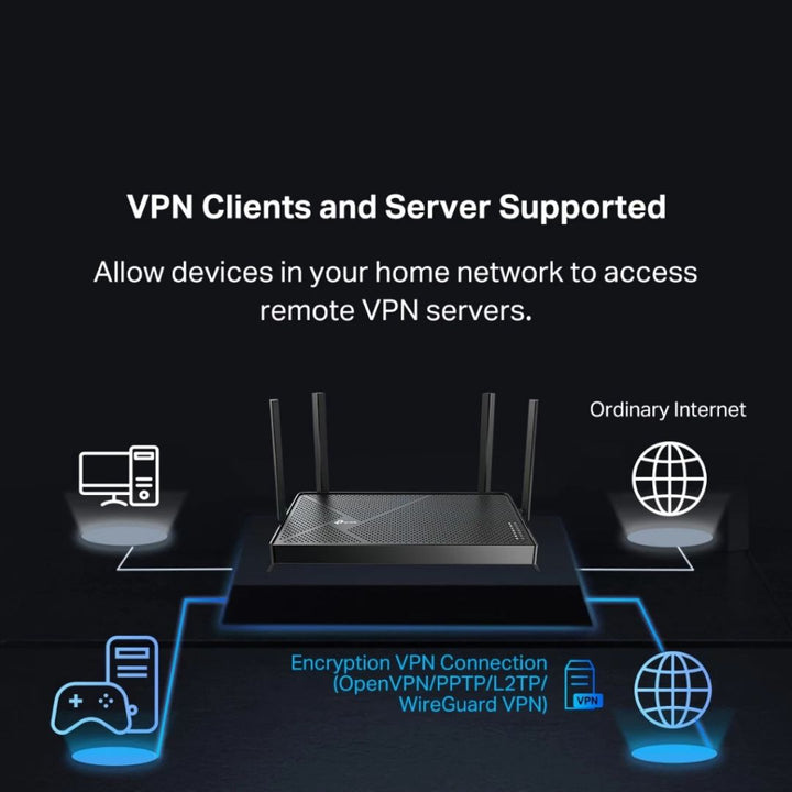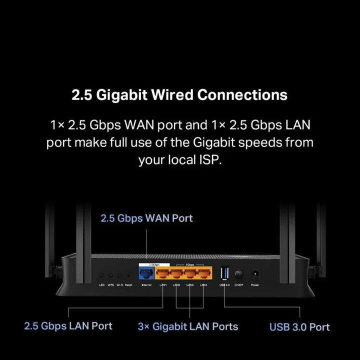 • 2× 2.5G Ports: 1× 2.5 Gbps WAN port, 1× 2.5 Gbps LAN port and 3× 1 Gbps LAN ports offer high-speed data transmissions.