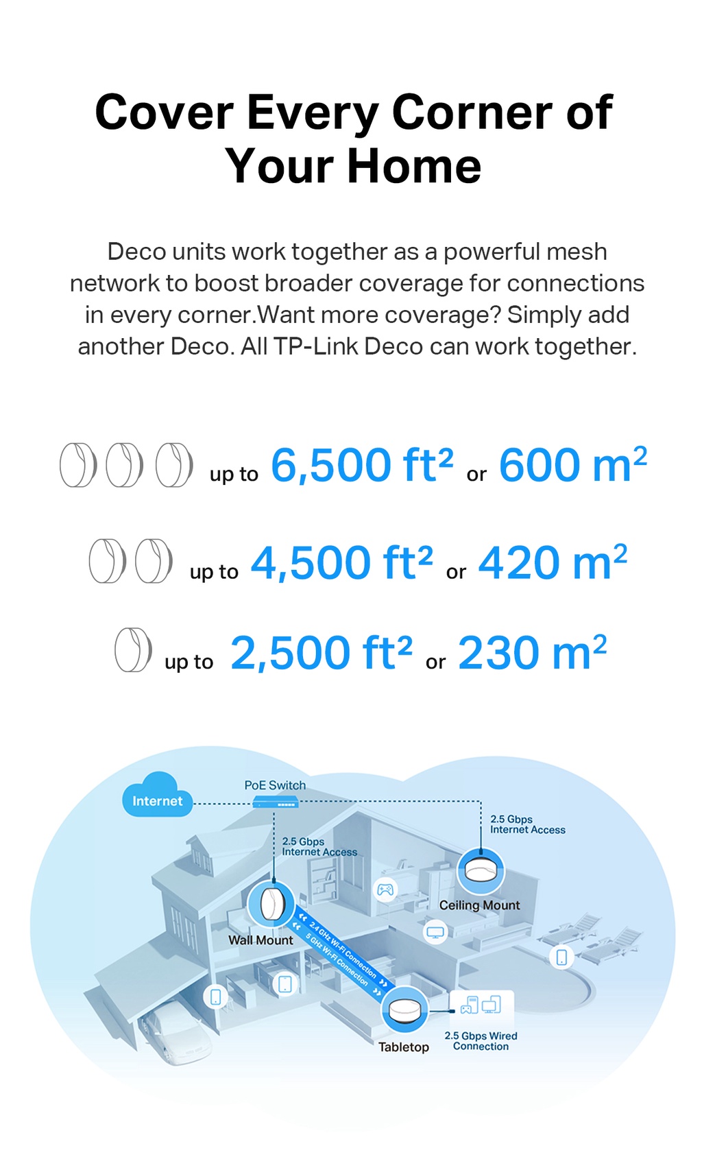 ● Deco X50-PoE (3-pack) up to 6,500 sq.ft