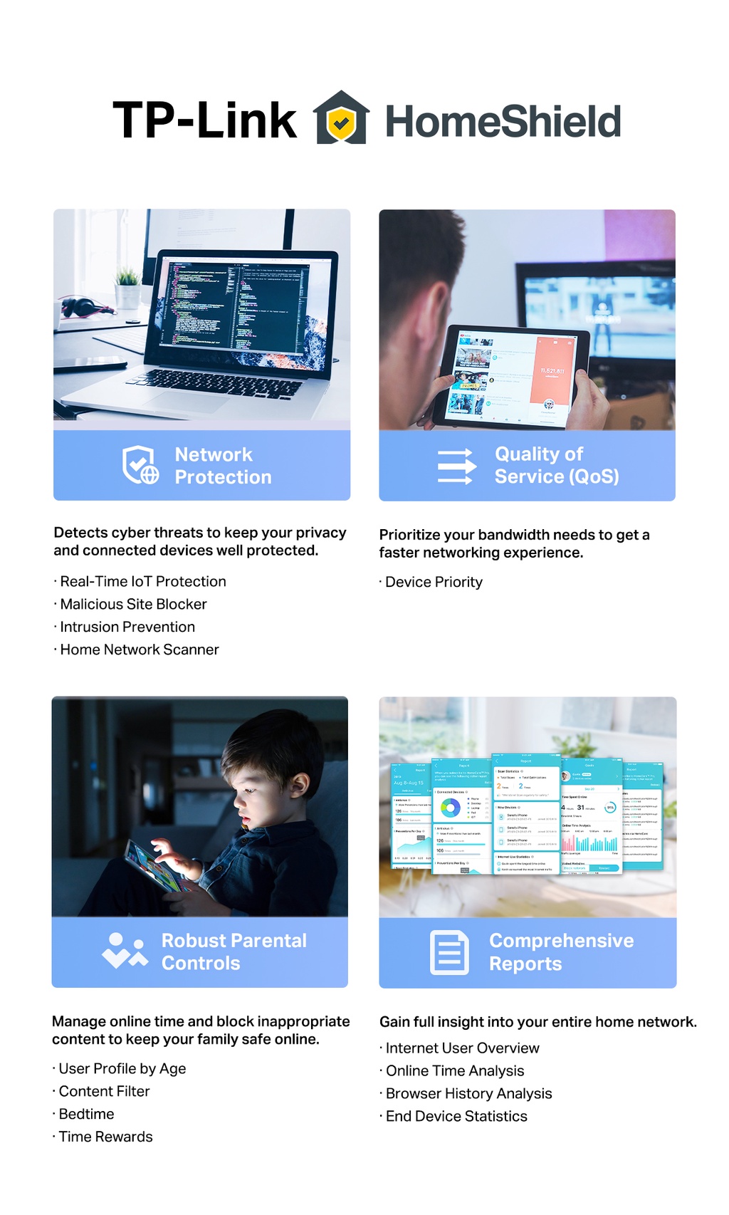 ◾TP-Link HomeShield – Provides comprehensive network protection, robust parental controls, and real-time IoT security.*