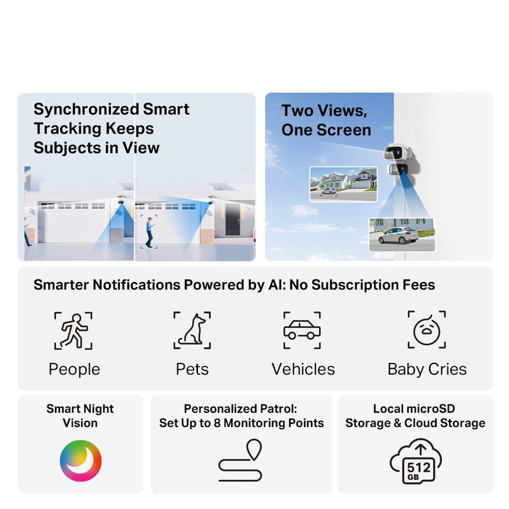 - Smart Night Vision -Choose from vibrant full-color with spotlights, discreet black-and-white infrared, or an automatic Smart Mode based on Al light detection for optimal clarity in any nighttime scenario.