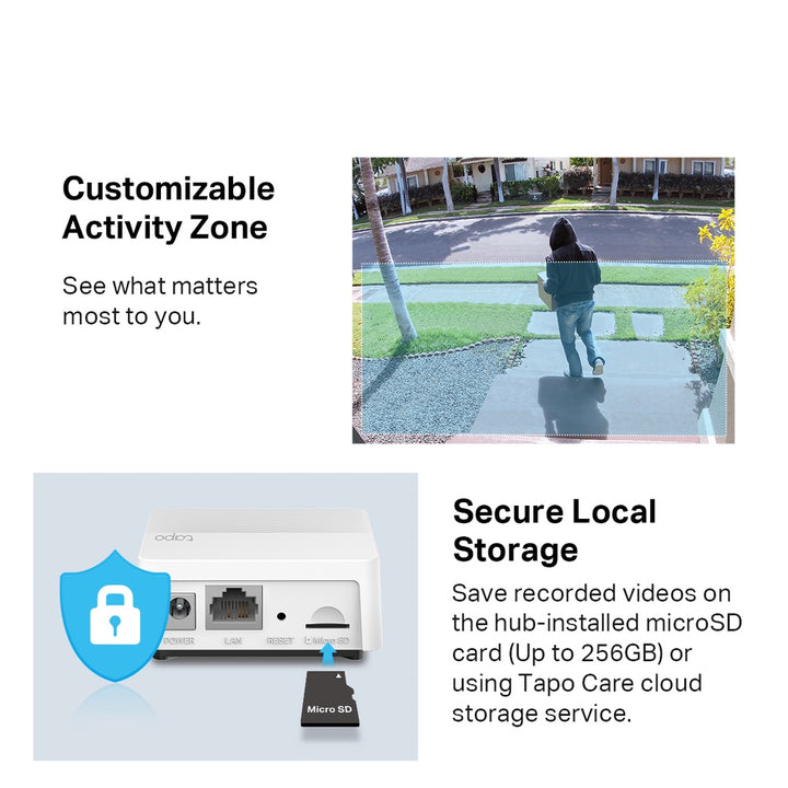 • Flexible Storage Choices - Save recorded videos on the hub-installed microSD card† (up to 256 GB) or by using Tapo Care** cloud storage services.